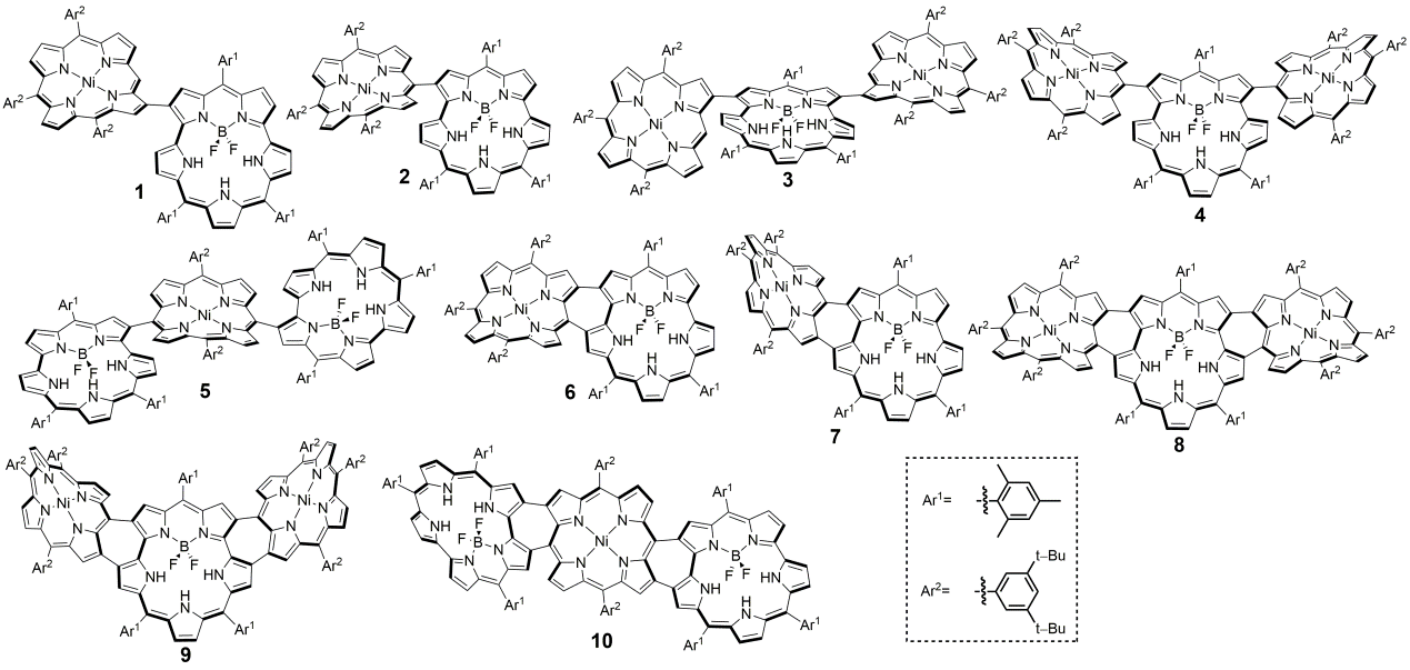 稠合卟啉阵列因具有扩展的π共轭体系,红移的吸收光谱及小的HOMO-LUMO能级差,而受到化学家的广泛关注。已报道的稠合卟啉阵列均以六元碳环或八元碳环桥接的方式进行稠合,七元碳环桥接的稠合卟啉阵列却未见报道。该团队在前期smaragdyrin研究工作基础上(J. Am. Chem. Soc.,2018,140, 16533;),巧妙利用smaragdyrin和卟啉骨架结构特点,以[22]smaragdyrin-BF2的溴代物与NiII卟啉硼化物为原料,经铃木偶联反应及氧化稠合反应构筑了七元碳环桥接的、含有环庚三烯结构的smaragdyrin卟啉稠合杂化体6-10(图1)并对该类smaragdyrin卟啉稠合杂化体的结构和性能进行了深入研究。