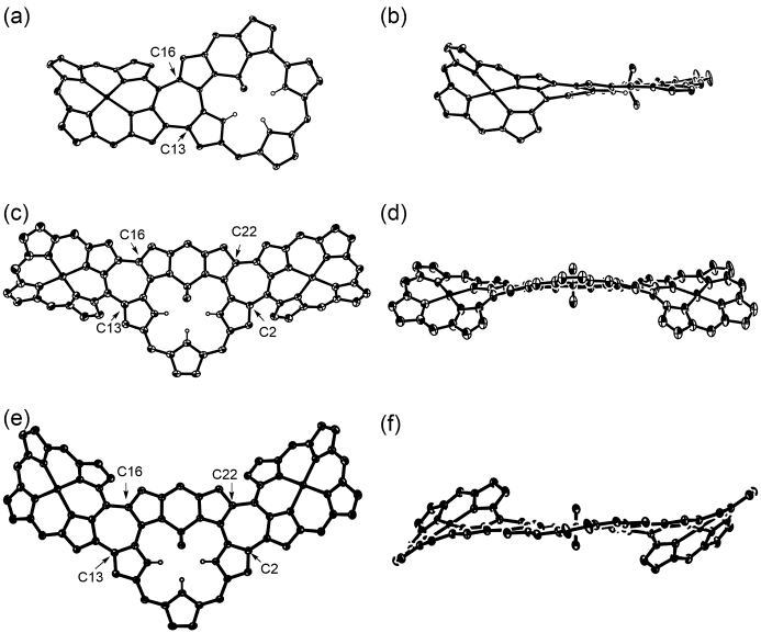 图2.化合物8: a), b);9: c), d)及10: e) f)的单晶结构。