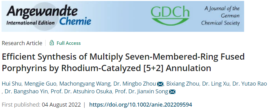 近日,化学化工学院宋建新教授团队周明波研究小组在卟啉类功能分子的设计、合成与性能研究方面再度取得重要进展,并在国际化学顶级期刊《德国应用化学》发表题为“Efficient Synthesis of Multiply Seven-Membered-Ring Fused Porphyrins by Rhodium-Catalyzed [5+2] Annulation”的学术论文(Angew. Chem. Int. Ed.2022,61,e202209594)。该论文获得了评审人的高度评价,并被推为HotPaper。