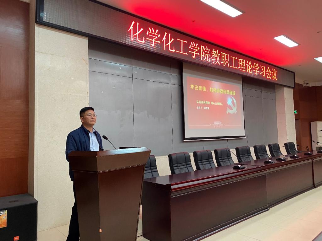 2021年10月14日下午,化学化工学院在230报告厅召开教职工政治理论学习会议。此次会议由院党委书记谭东波担任主讲人,院党委副书记罗艳主持。