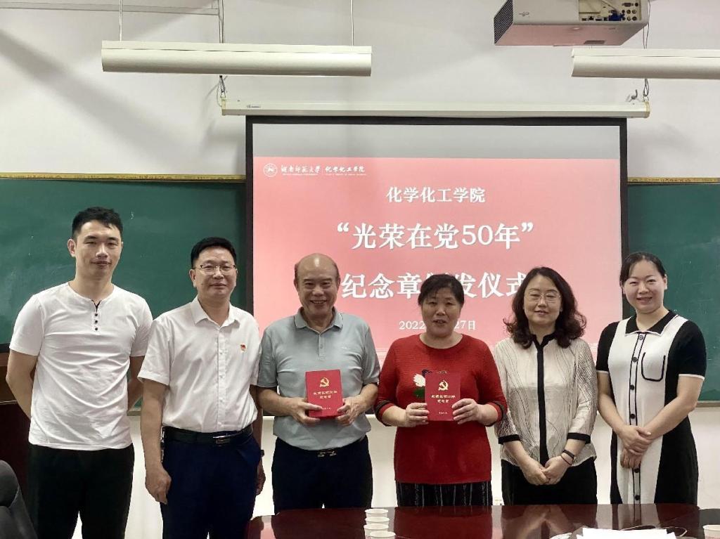 6月27日,化学化工学院举行“光荣在党50年”纪念章颁发仪式暨离退休党支部主题党日活动。纪念章颁发仪式在206会议室举行,党委书记谭东波、党委副书记段婷、专职组织员梁艳芳、教育部重点实验室专职副主任周子虬出席仪式。仪式由离退休一党支部书记易理国主持。
