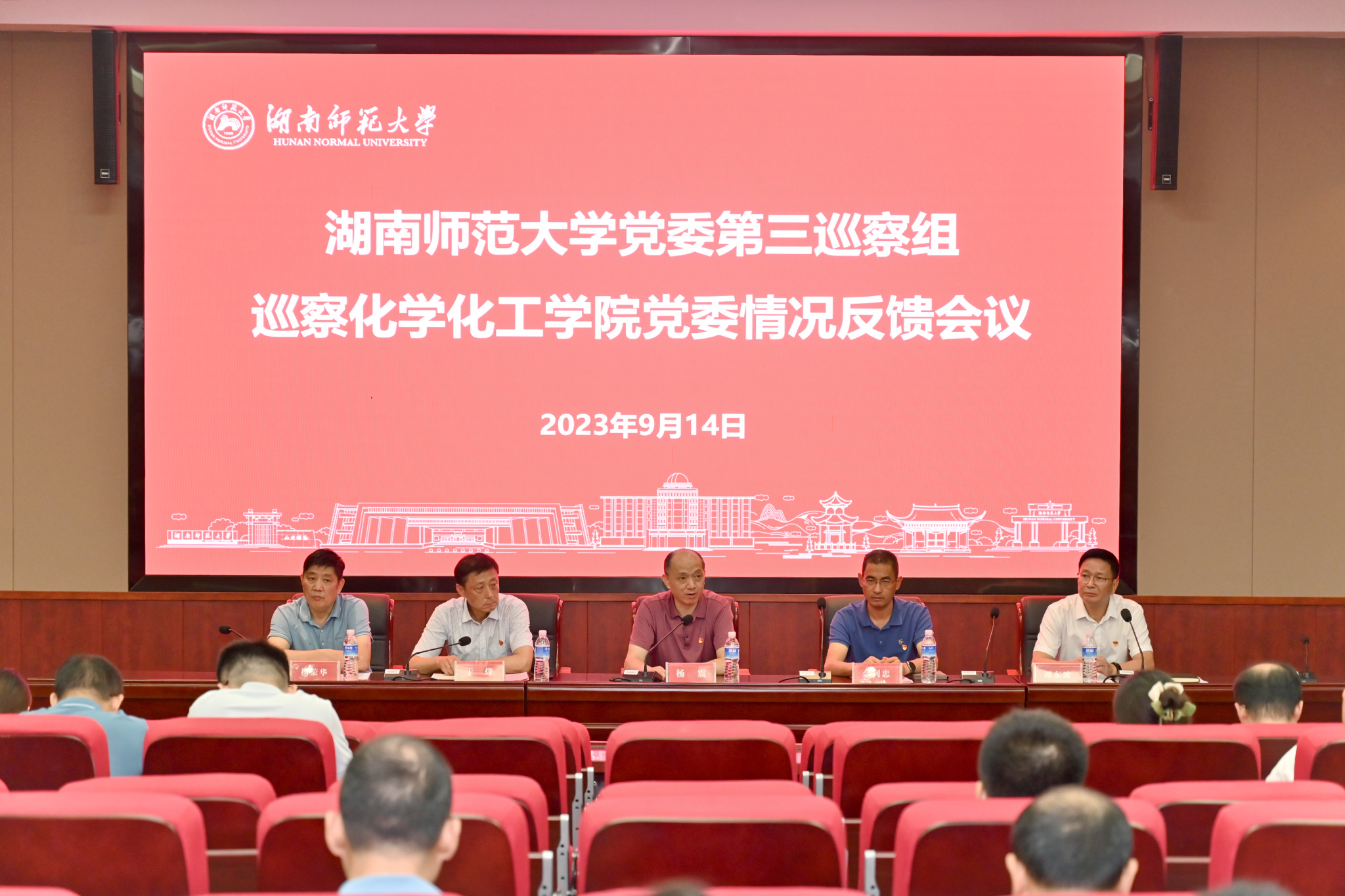 根据太阳集团电子游戏党委巡察工作统一部署,2023年9月14日下午,学校党委第三巡察组在化学化工学院化学楼达嘉维康报告厅召开党委巡察情况反馈会议。学校党委委员、副校长杨震,学校党委巡察办专职副主任佘利忠,学校党委第三巡察组组长于烽、副组长李春莲出席会议,学院党委书记谭东波主持会议。