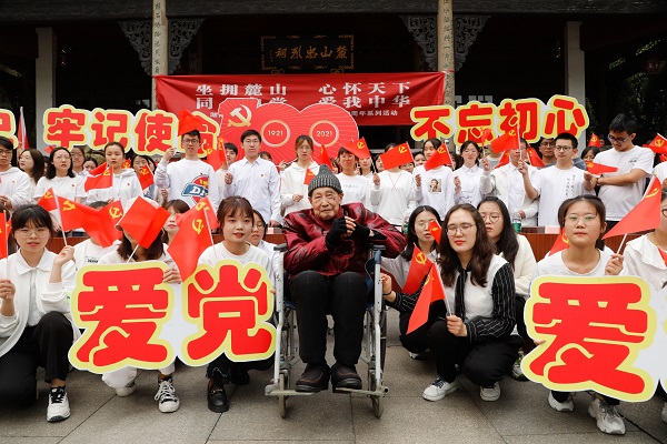 姚春梅一行专程前往百岁老人林立炟教授家中亲切慰问,学生代表为其献花相关领导及师生陪同其前往忠烈祠广场共同庆祝建党100周年。