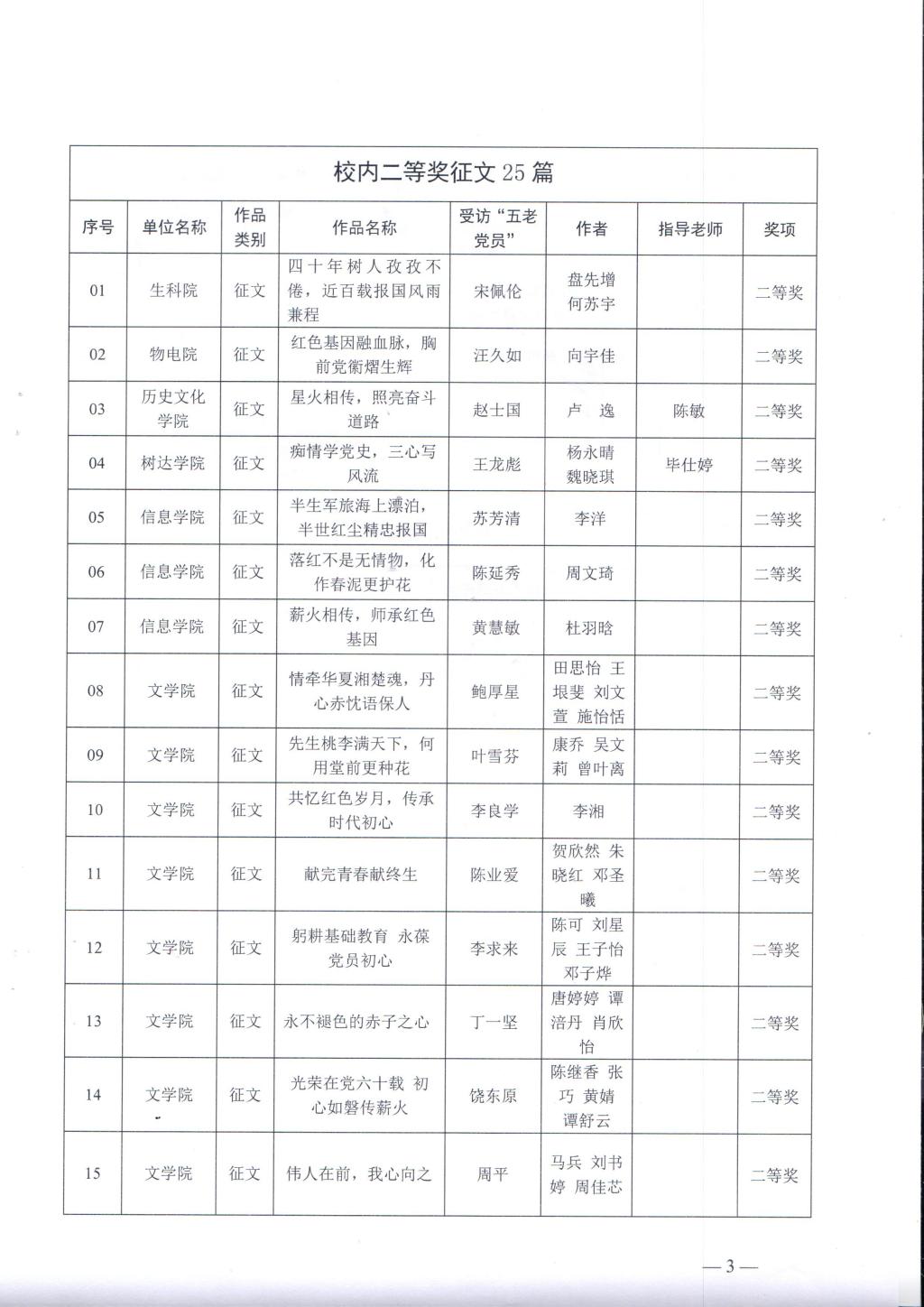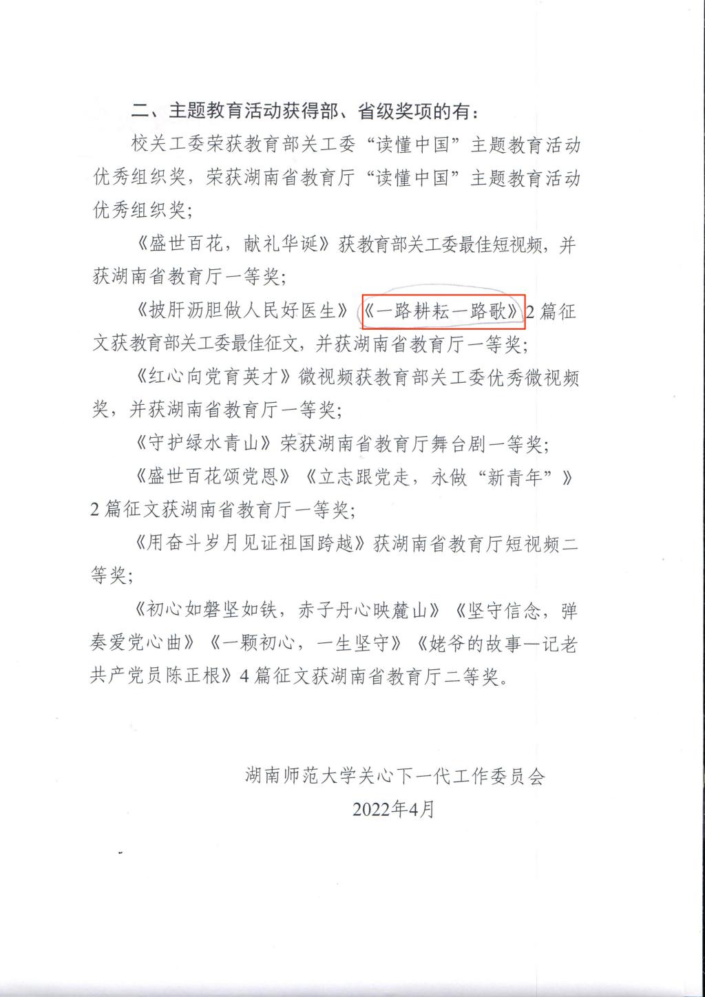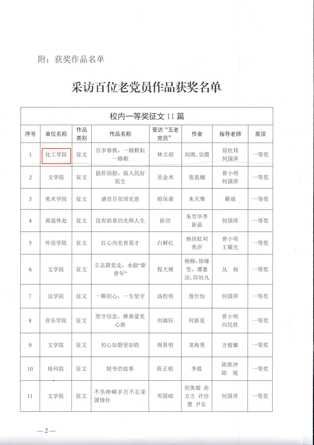 同时,化工院关工委在“庆祝建党百年华诞,采访百位老党员”主题征文活动中,由刘湘和宗霞同学撰写,屈杜炜和何国萍老师指导,记述我院百岁老人林立炟教授真实故事的征文作品——《百岁春秋,一路耕耘一路歌》荣获教育部关工委最佳征文、湖南省教育厅一等奖以及校内一等奖等多项荣誉。此次活动以征文、视频等方式引导青年学习老党员的优秀事迹,进一步激发青年对中国共产党的拥护、热爱之情。