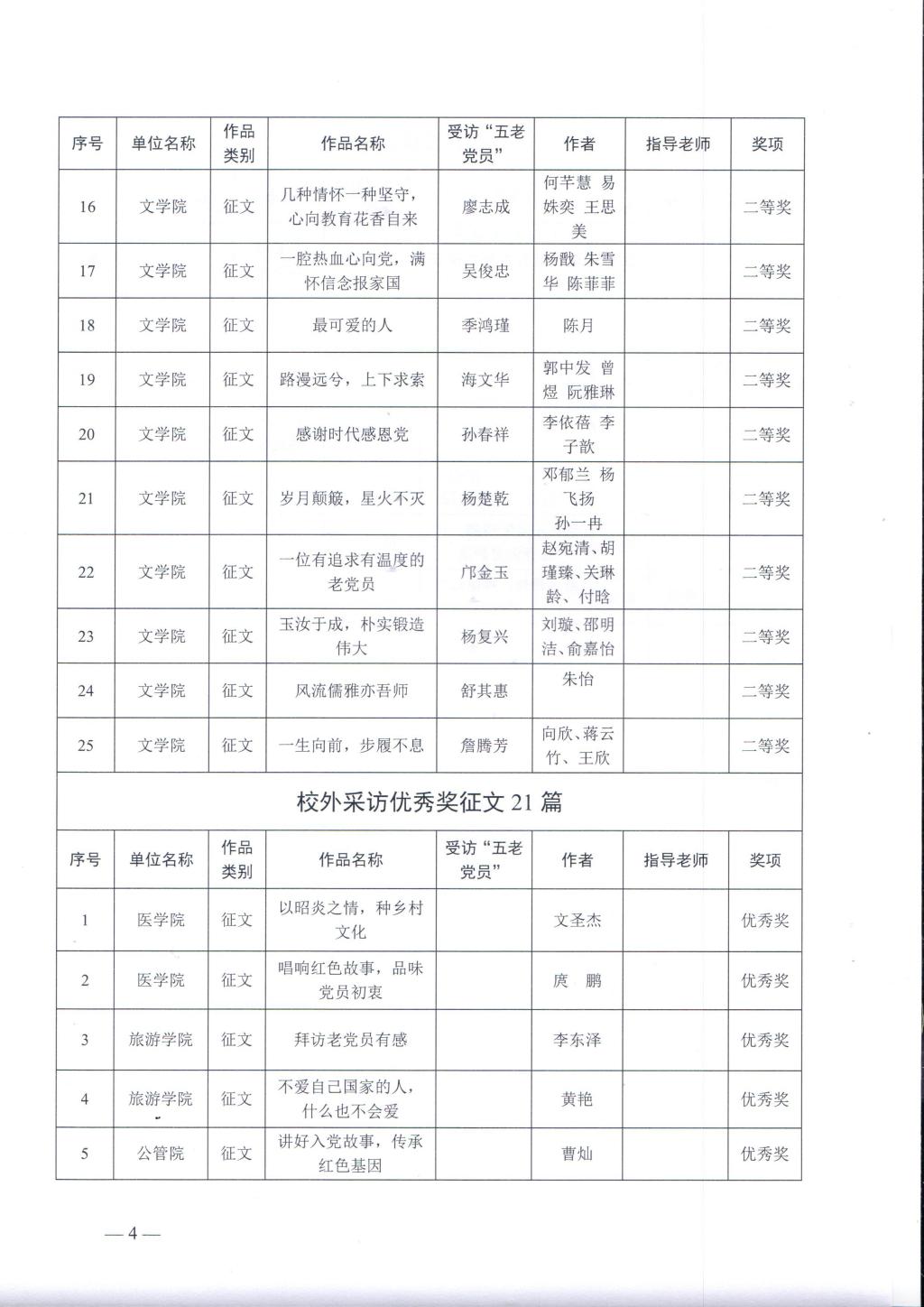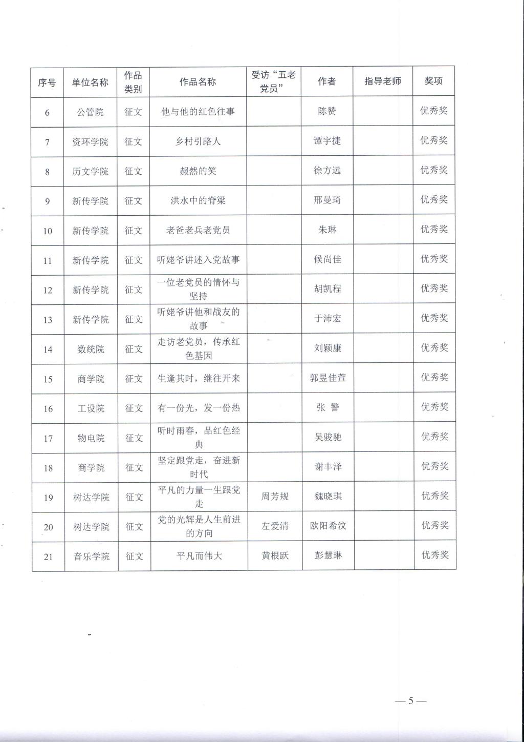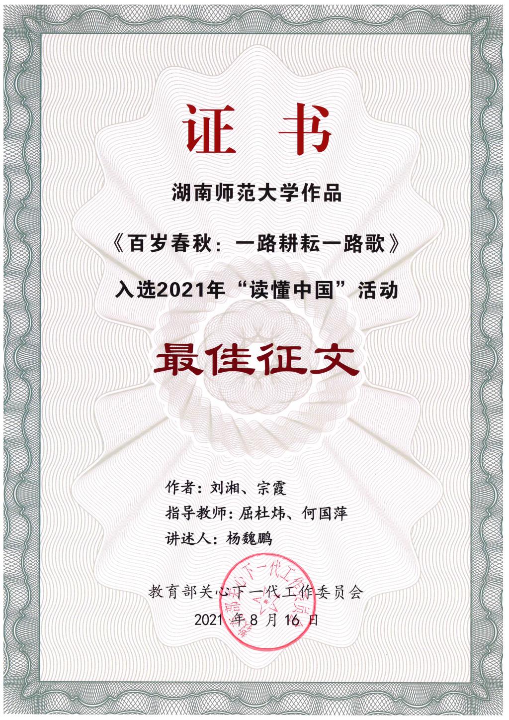 同时,化工院关工委在“庆祝建党百年华诞,采访百位老党员”主题征文活动中,由刘湘和宗霞同学撰写,屈杜炜和何国萍老师指导,记述我院百岁老人林立炟教授真实故事的征文作品——《百岁春秋,一路耕耘一路歌》荣获教育部关工委最佳征文、湖南省教育厅一等奖以及校内一等奖等多项荣誉。此次活动以征文、视频等方式引导青年学习老党员的优秀事迹,进一步激发青年对中国共产党的拥护、热爱之情。