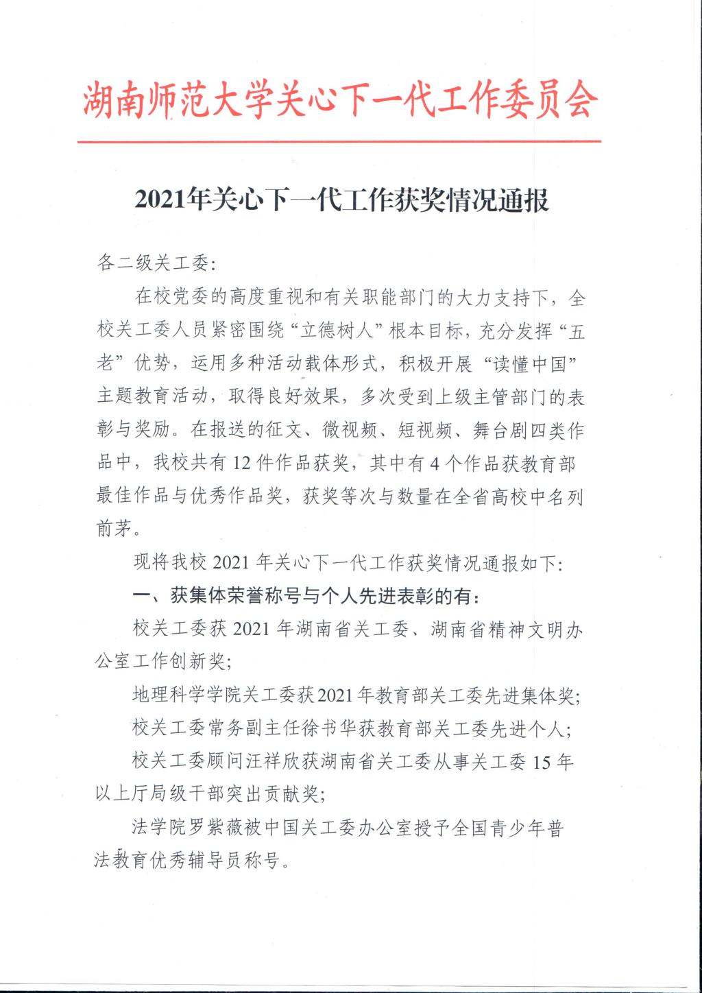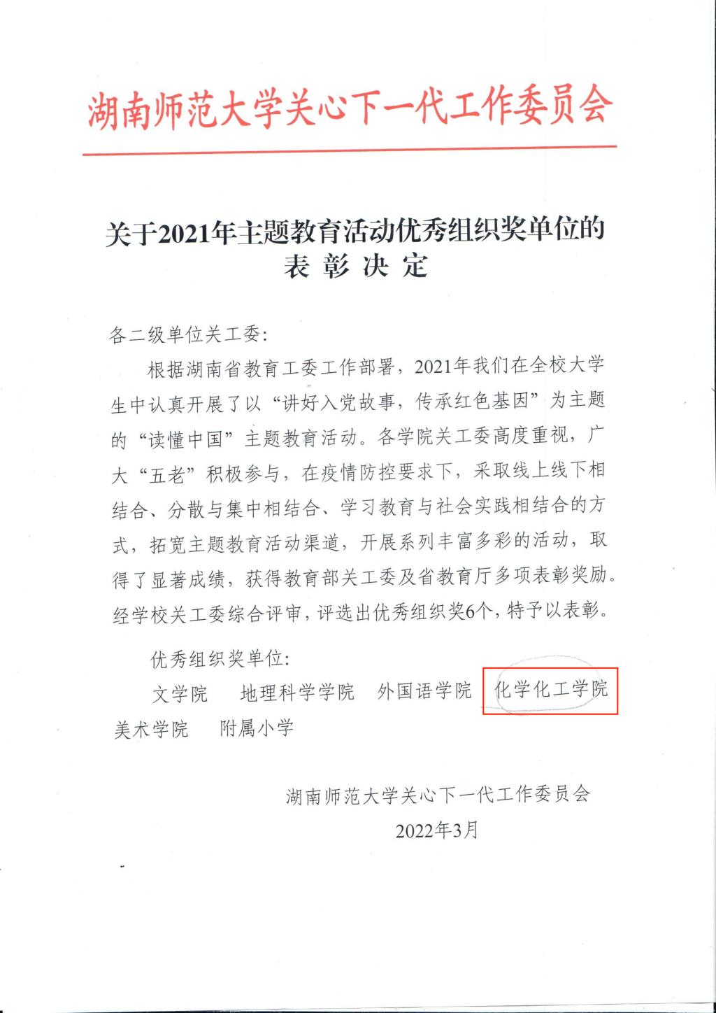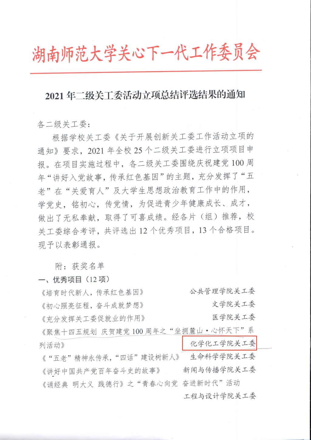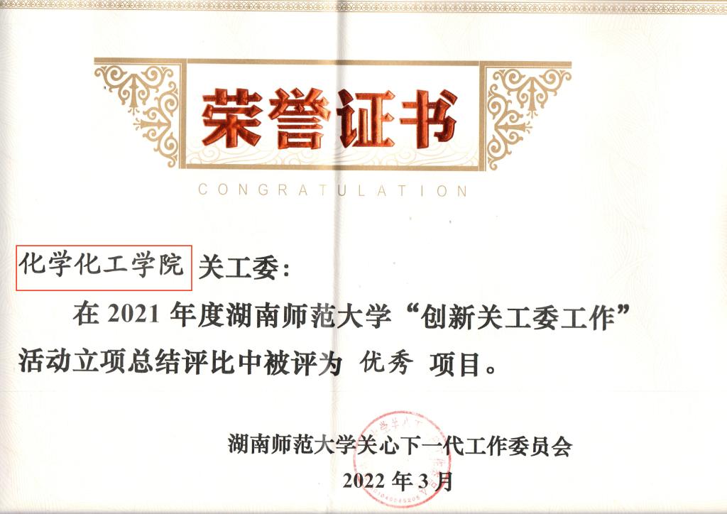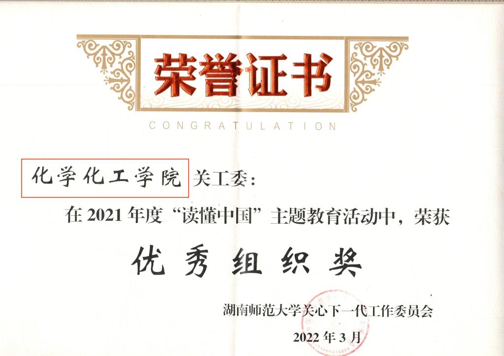 化学化工学院关工委在2021年度“读懂中国”主题教育活动中,荣获优秀组织奖。同时,在2021年度太阳集团电子游戏“创新关工委工作”活动立项总结评比中被评为优秀项目。