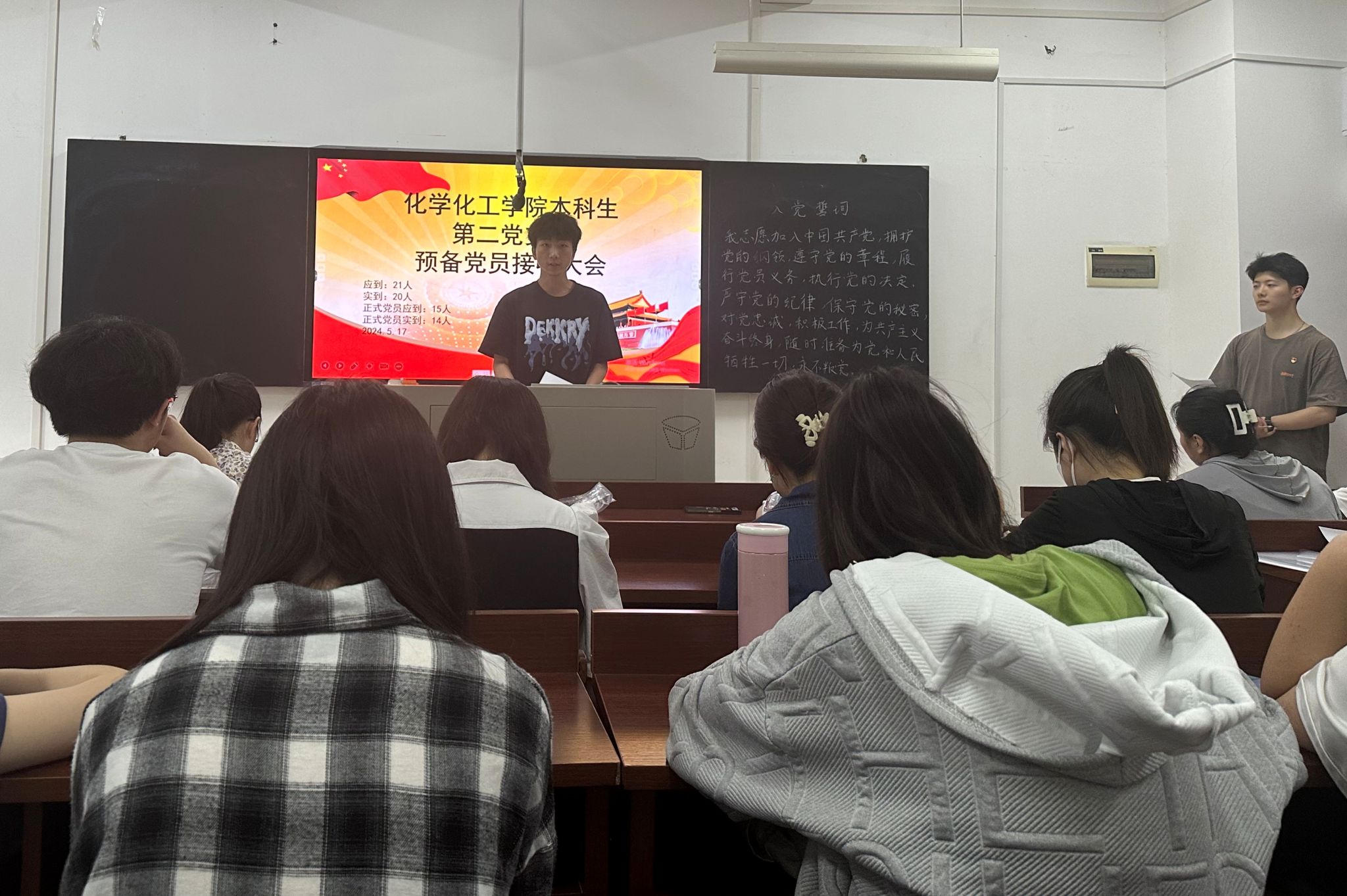 (通讯员 张钰佳)5月17日12时30分,化学化工学院本科生第二党支部于化工院217教室召开预备党员接收大会,讨论关于唐彬、陈伊睿等14名同志接收为预备党员的问题。此次大会由周锐主持,支部成员均准时参加。