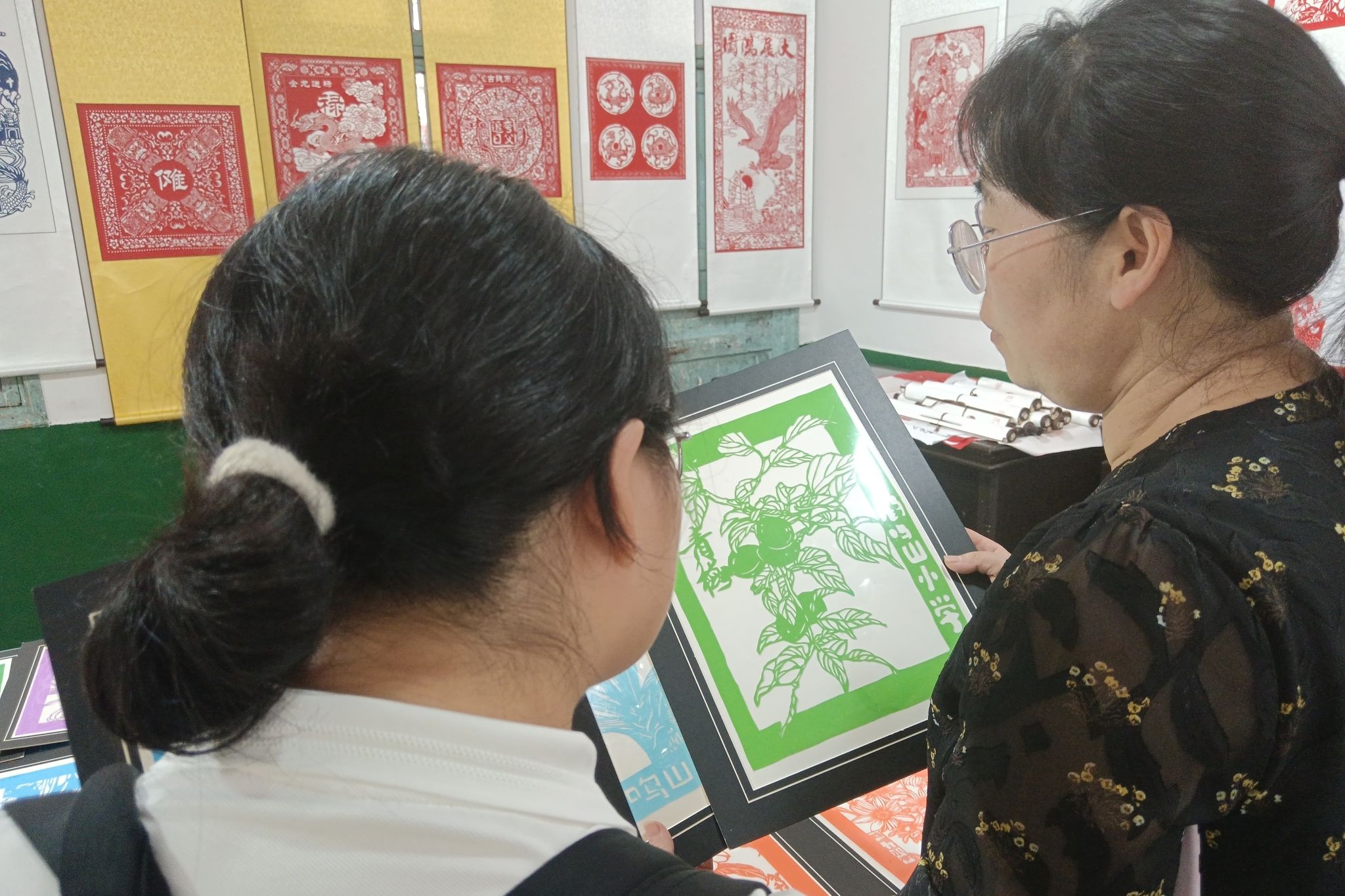 鹤鸣山小学罗春蓉老师为调研组成员展示学生辰州剪纸作品