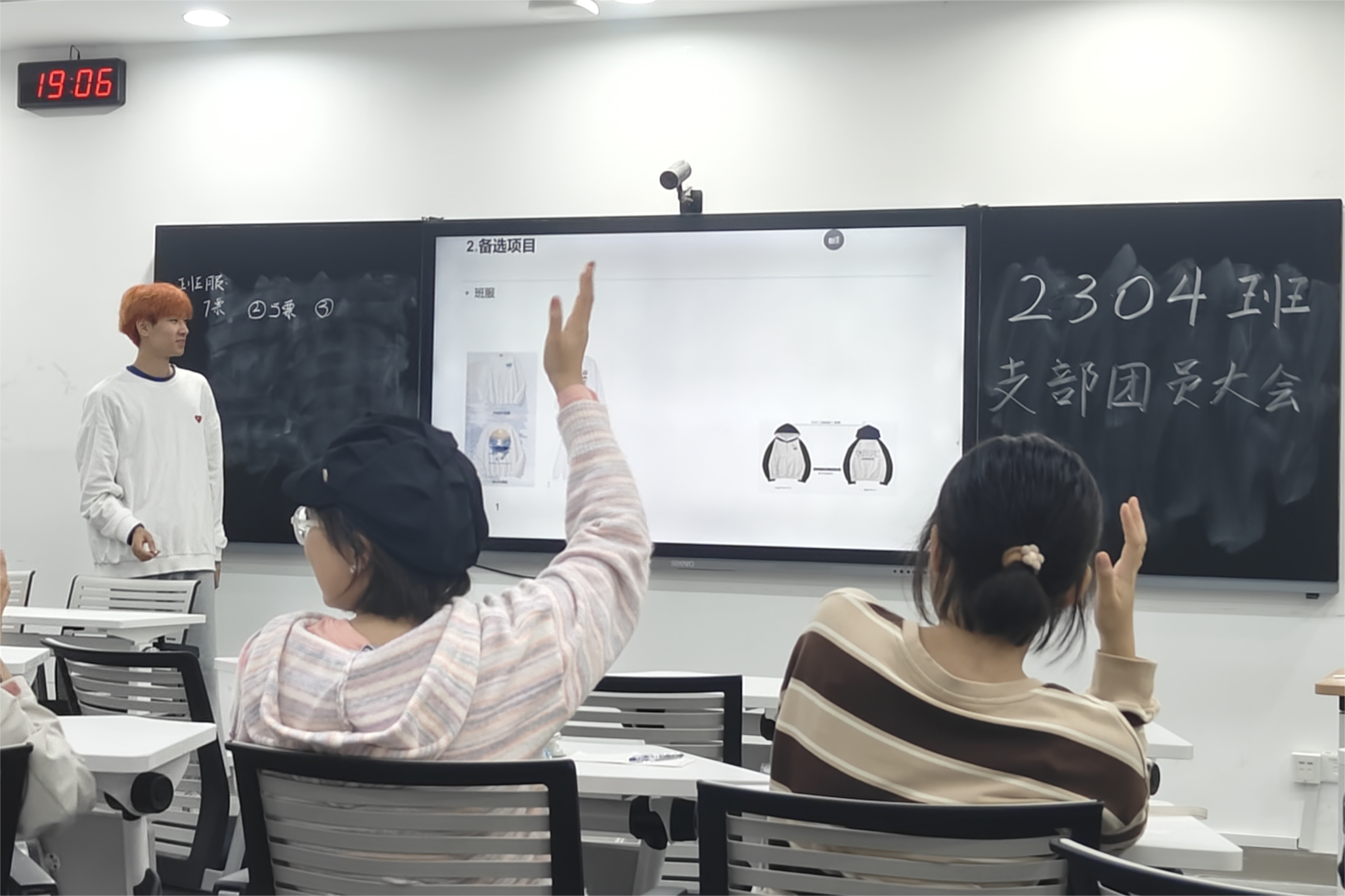 此次会议由2304班班长刘创主持,其余班委进行协助。会议主要通过班级内部投票确定班服、班徽、班级口号、班歌、班训的主要内容和风采展活动的主要形式,并安排了班服、班徽定制和风采展排练的主要负责人。