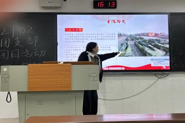 向梦圆以我国“东风家族”导弹的发展为引,为同学们介绍了近几年中国在科技创新领域取得的成就。向梦圆在带领同学们回顾我国科技发展历史的同时,介绍了习近平主席在二十大报告中强调的创新驱动发展战略,旨在强调科技强国和创新强国的必要性。最后环节,贺瑶分享了她对本次团日活动的体会:作为大学生,我们正处于学习和探索的黄金阶段,可以通过积极参与科普宣传志愿活动和科研项目来培养创新思维和实践能力,积累科技经验,为科技强国的建设增添新的动力。