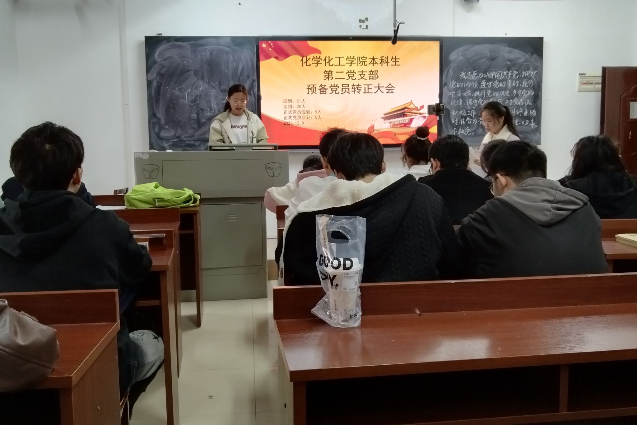 (通讯员 周福中)12月8日12时30分,化学化工学院本科生第二党支部和第三党支部在化工院210教室举行了预备党员转正大会,讨论了关于严晋等8名同志申请转为正式党员的问题。与会人员为本科生第二党支部第一书记唐健清同志、本科生第二党支部的20名同志、本科生第三党支部的21名同志。此次会议由本科生第二党支部书记余思宇同志主持。