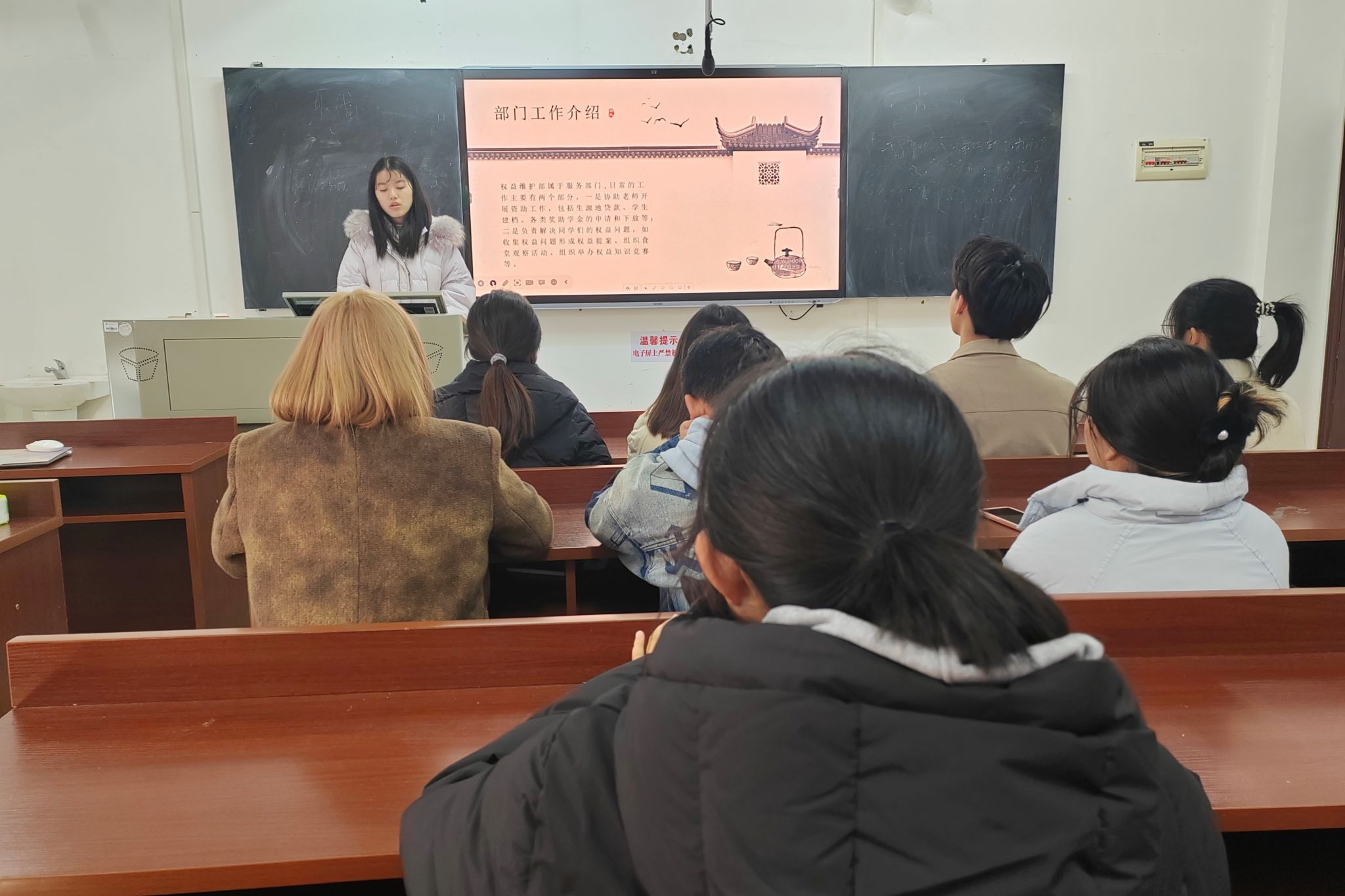 活动伊始,化工院权益部第一负责人向妮为大家介绍了化工院权益部的主要工作,她将权益部工作分为两个部分——分别是资助工作和权益工作,并就两方面的工作内容进行了详细的讲解,总结出了工作中遇到的问题以及解决方法:部门如果出现问题,要及时反思,争取不再犯错;并且每位成员要做到将问题事无巨细地上报。