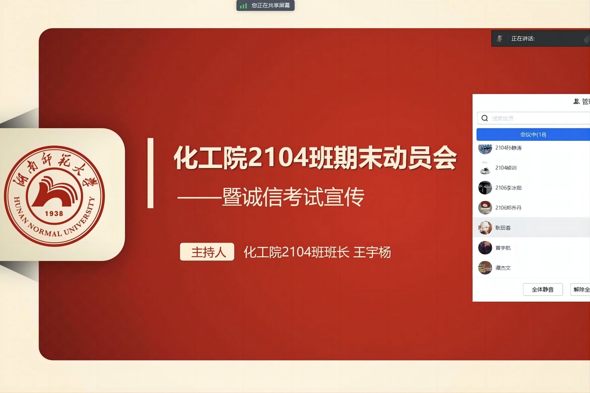 (通讯员 王宇杨)12月20日19时30分,化学化工学院2104班全体同学通过线上会议方式开展了2023-2024学年上学期期末考试动员班会暨诚信考试宣传会议,此次会议由班长王宇杨主持。