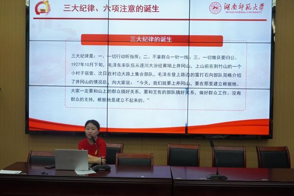此次宣讲分为“井冈山精神产生的背景”、“井冈山精神的科学内涵”、“三大纪律、八项注意的诞生”、“井冈山精神的现实意义”四部分。宣讲伊始,主讲人提问了井冈山精神产生的背景,大部分参会同学主动举手回答;主讲人结合历史背景指出其精神内涵——相信群众、依靠群众是井冈山精神的根本。随后,主讲人介绍了由毛泽东行军过程中结合实际所诞生的“三大纪律、八项注意”,并结合当今实际阐述了井冈山精神的现实意义。