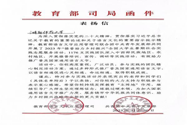 (通讯员 胡筱晨)近日,教育部语言文字应用管理司、共青团中央青年发展部发来表扬信,对我校积极开展2023年“推普助力乡村振兴”全国大学生暑期社会实践志愿服务活动给予了表扬,对我校实践团队积极推广普及国家通用语言文字、助力乡村振兴给予了高度肯定。其中化学化工学院“麓山青年”暑期社会实践队获2023年“推普助力乡村振兴”全国大学生暑期社会实践志愿服务活动优秀团队。