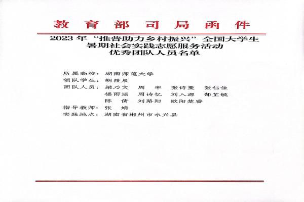 据悉,2023年“推普助力乡村振兴”全国大学生暑期社会实践志愿服务活动共有来自全国1056所高校的4123支团队报名参加,1176支团队入选,240支队伍获评为“优秀团队。湖南省仅有5支队伍获此荣誉。