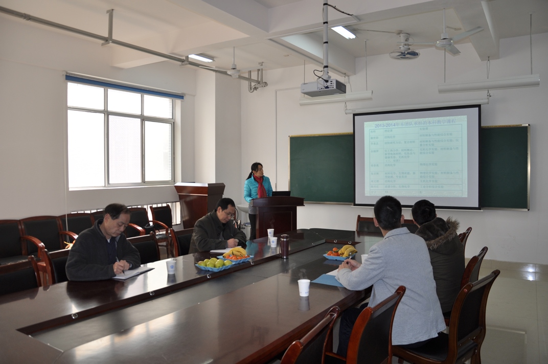 首先,教研室主任余丽萍从四个方面介绍了材料·能源教研室近两年来的工作:(一)勇挑教学重担:团队5位老师共承担了11门理论课和4门实验课程的教学任务;按照新修订的2013年版教学大纲,该团队将需要承担更多新课程,教学任务繁重。(二)组织教学研究:该团队目前承担1项省级教学改革项目同,1项校级的教学改革项目和3门校级精品课程的建设。团队鼓励青年教师积极参与学校的课堂竞赛,并给青年教师一定的指导;(三)注重师生交流:分别举办了2014级应用化学专业新生师生见面会、强化专业教育,2012级应用化学专业师生交流会、回答学生有关课程学习、考研、择业、就业等问题。(四)加强文体活动:在完成好教学工作和科研工作的同时,团队每年开展一次羽毛球比赛,促进老师们劳逸结合、加深了解、增进团结,以利于更好地开展教学活动。余老师还提出今后的教学活动要常态化,并着重提出了2015年应着手完成的教学工作。