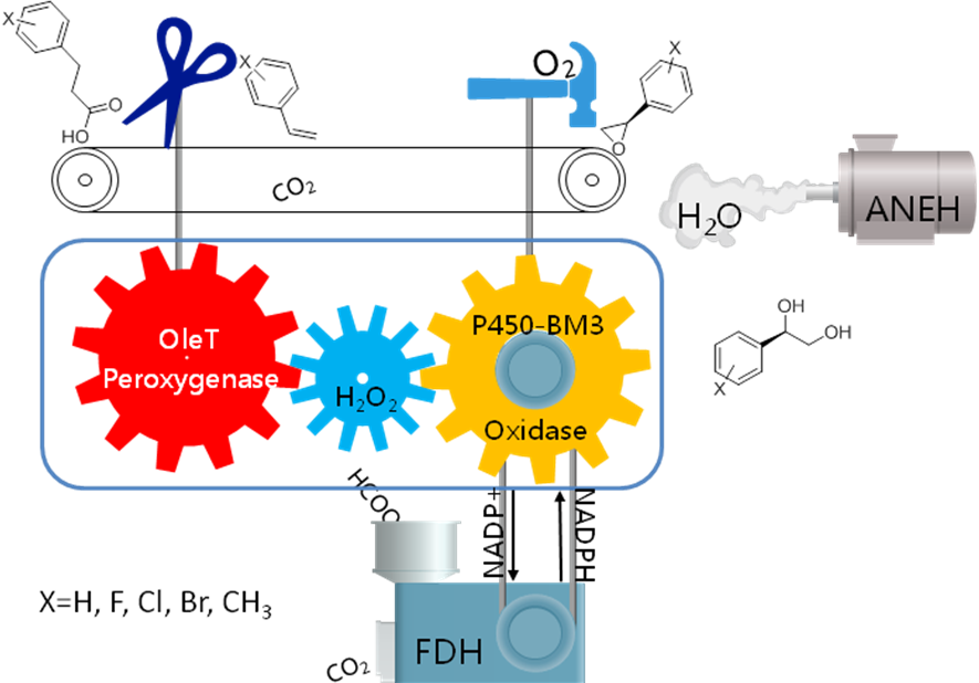 依据氧化酶和过氧化酶的活性特点,可以设计出一套氧化酶-过氧化酶互惠互利的串联反应这一概念指导下,王健博课题组设计了一个基于P450单加氧酶-P450过氧化酶互惠互利体系的串联反应,从3-苯丙酸及其同系物出发,经三步反应生成以较高的转化效率和对应选择性合成了苯乙二醇及各类同系物。该研究首次提出了这一互惠互利体系,并且将其应用于不对称催化合成方面,证实其H2O2内循环的机理,对构建经济高效的生物催化串联反应,将其用于合成医学材料等方面相关的化合物具有重要的意义。