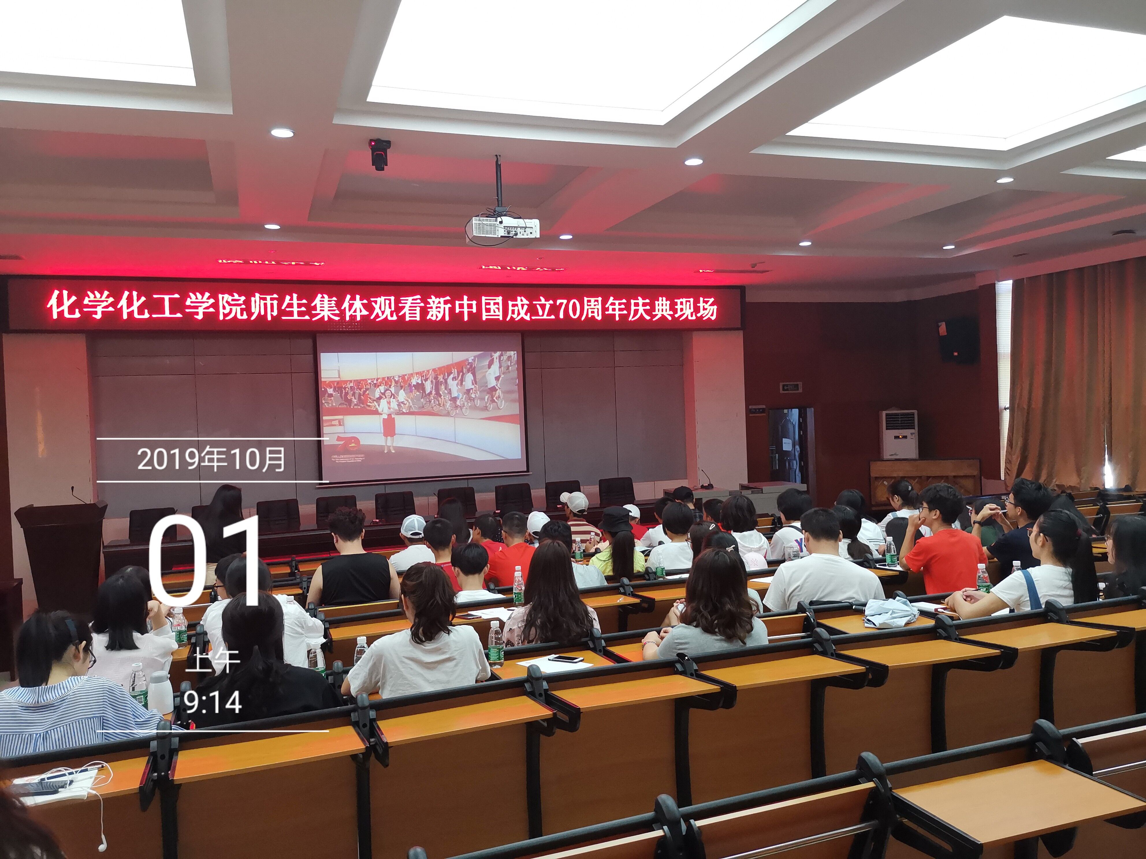 10月1日上午,化学化工学院党委在报告厅组织观看“庆祝中华人民共和国成立70周年阅兵仪式”实况直播。院党委副书记耿自强、科研副院长宋建新、成教办主任王勇民等来到直播会场,与师生们共同观看了盛大的阅兵仪式。