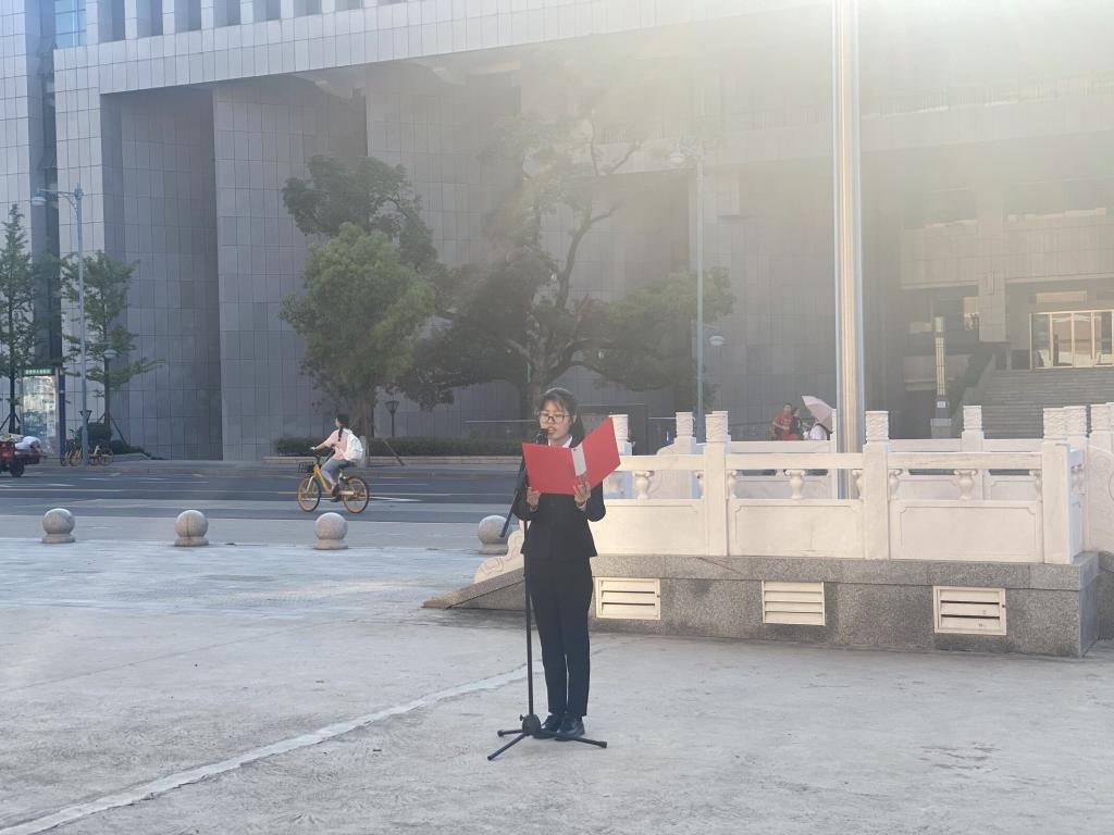仪式开始,国旗护卫队出旗,全体师生齐唱国歌,肃立并向五星红旗行注目礼。随后,化工院学生代表邓书平和生科院学生代表陈杉进行国旗下演讲。邓书平希望同学们志存高远,勇立鸿鹄之志,更能打破常规,迎头并进,稳中求进时不忘初心,同时,她结合历史,倡导新时代青年在思想争鸣中保持文化自信,保持爱国热情,为中国的发展不懈奋斗。