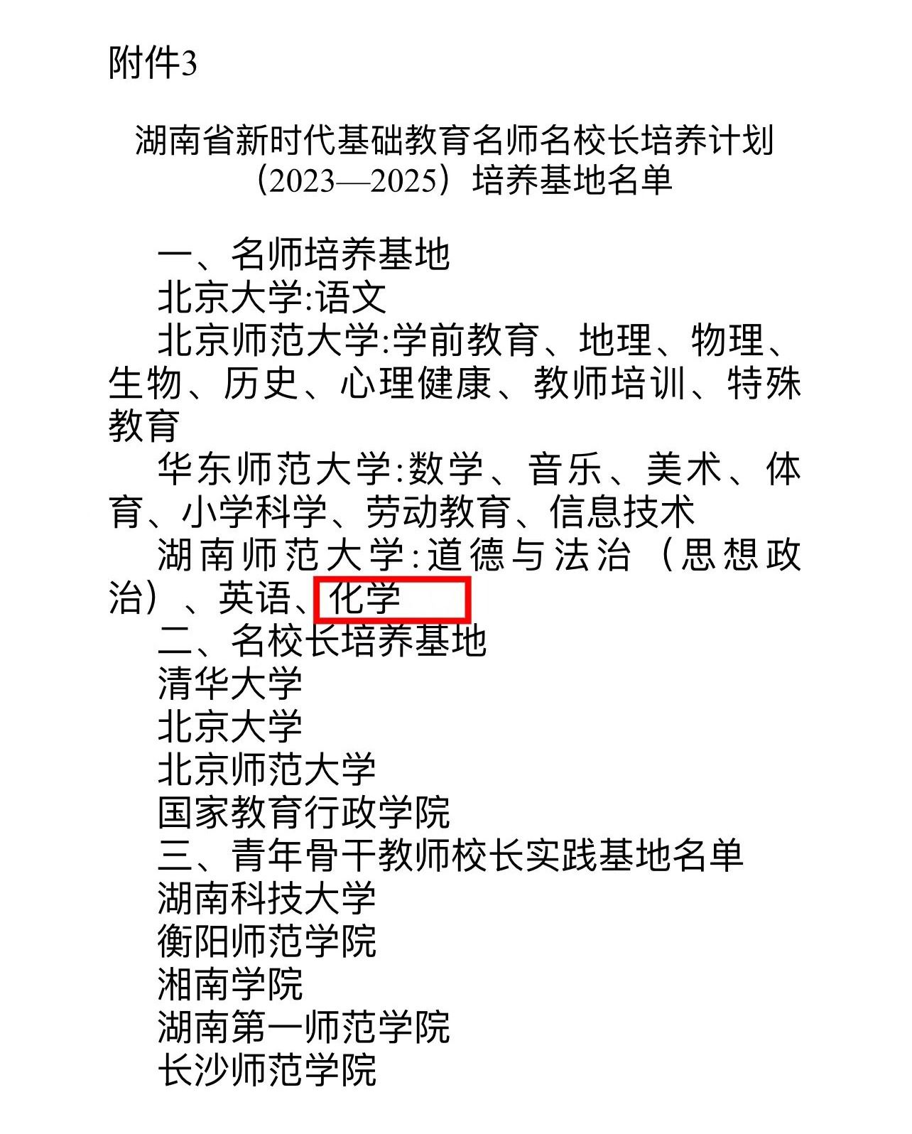 近日,湖南省教育厅下发《关于公布湖南省新时代基础教育名师名校长培养计划(2023—2025)培养对象及培养基地名单的通知》(湘教通〔2023〕8号),北京大学、北京师范大学、华东师范大学和我校等4所高校入选湖南省新时代基础教育名师培养基地。我校道德与法治(思想政治)、英语和化学三个学科承担名师培养任务。