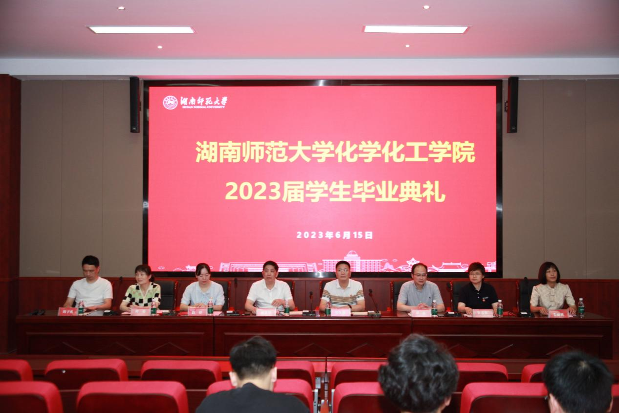 (通讯员 刘耘亦 任天阔)6月15日下午,化学化工学院2023届学生毕业典礼在化学楼达嘉维康报告厅隆重举行。化学化工学院院长杨荣华,党委书记谭东波,党委副书记段婷,副院长谭亮、宋春红、谭蓉,国家地方联合工程实验室专职副主任毛丽秋,教育部重点实验室专职副主任周子虬,化学系主任周旺,制药工程系主任钟世华以及研究生学科负责人,本科生班导师,教务办和学工办成员出席毕业典礼。典礼由本科毕业生辅导员唐健清主持。