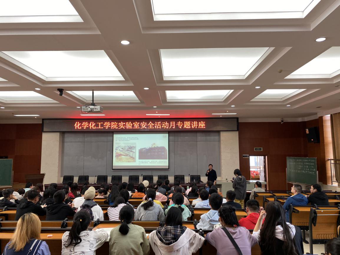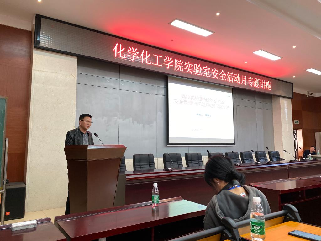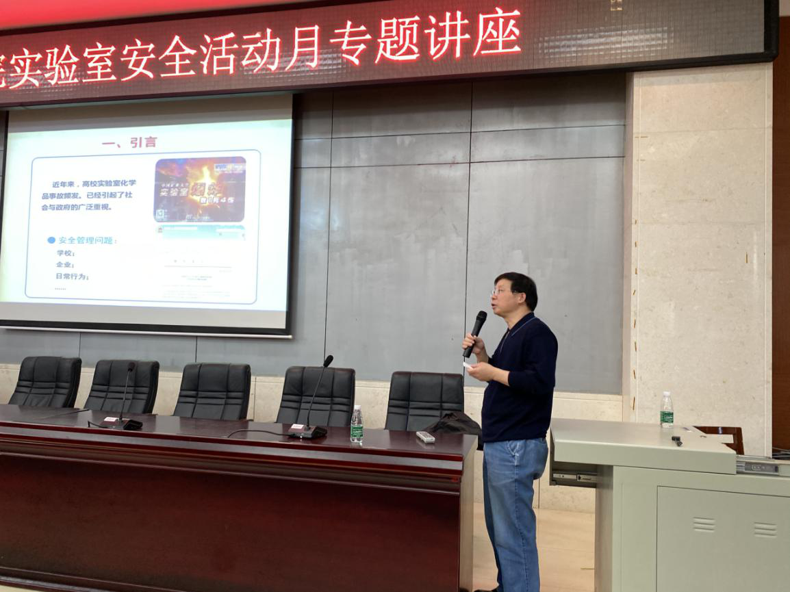 10月22日下午,根据学校实验室安全管理工作部署,化学化工学院在报告厅举办了实验室安全活动月专题讲座。此次讲座的主题为《高校实验室危险化学品安全管理与风险隐患排查方法》,主讲人为湖南大学化学化工学院郭栋才教授。讲座由化学化工学院副院长谭东波主持。