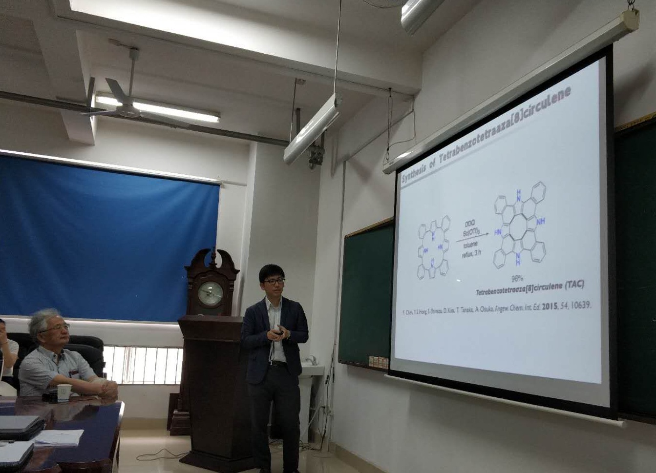 5月24日上午9:00京都大学Takayuki Tanaka 助理教授在化工院新楼206会议室为我院师生带来一场题为“Synthesis and Properties of Novel Polycyclic Herteroaromatics”的学术报告。报告由我院副院长宋建新教授主持,化工院的部分老师和学生聆听了此次报告。