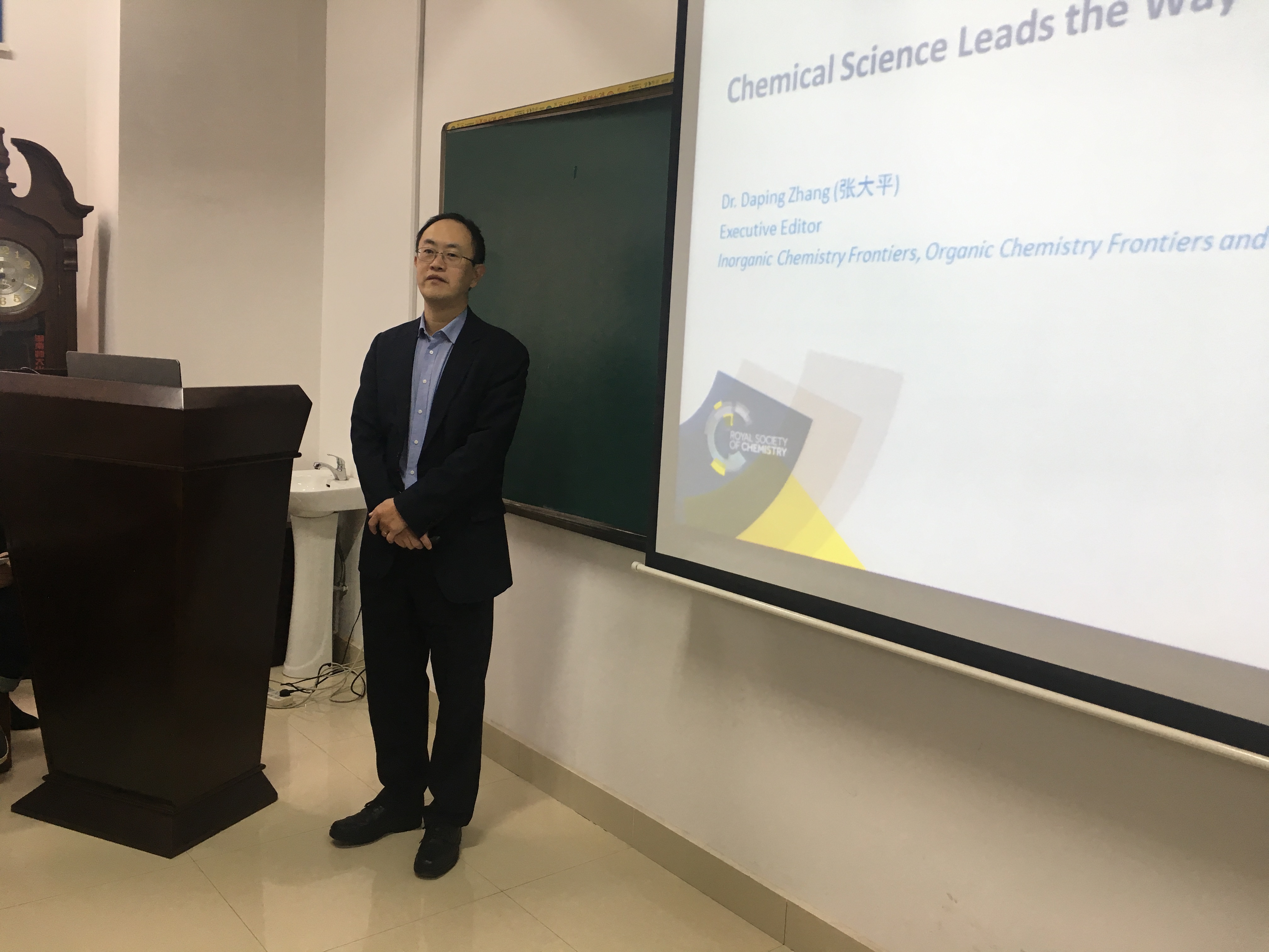 报告中,张大平博士简要介绍了部分国际权威学术期刊及机构,接着张博士详细介绍了英国皇家化学会(RSC)的情况。他还重点对学术论文投稿的注意事项等进行了分析和总结。此次报告使在场师生详细了解了RSC期刊的具体情况及有关投稿技巧,并对提高的学术论文投稿效率起到了积极作用.