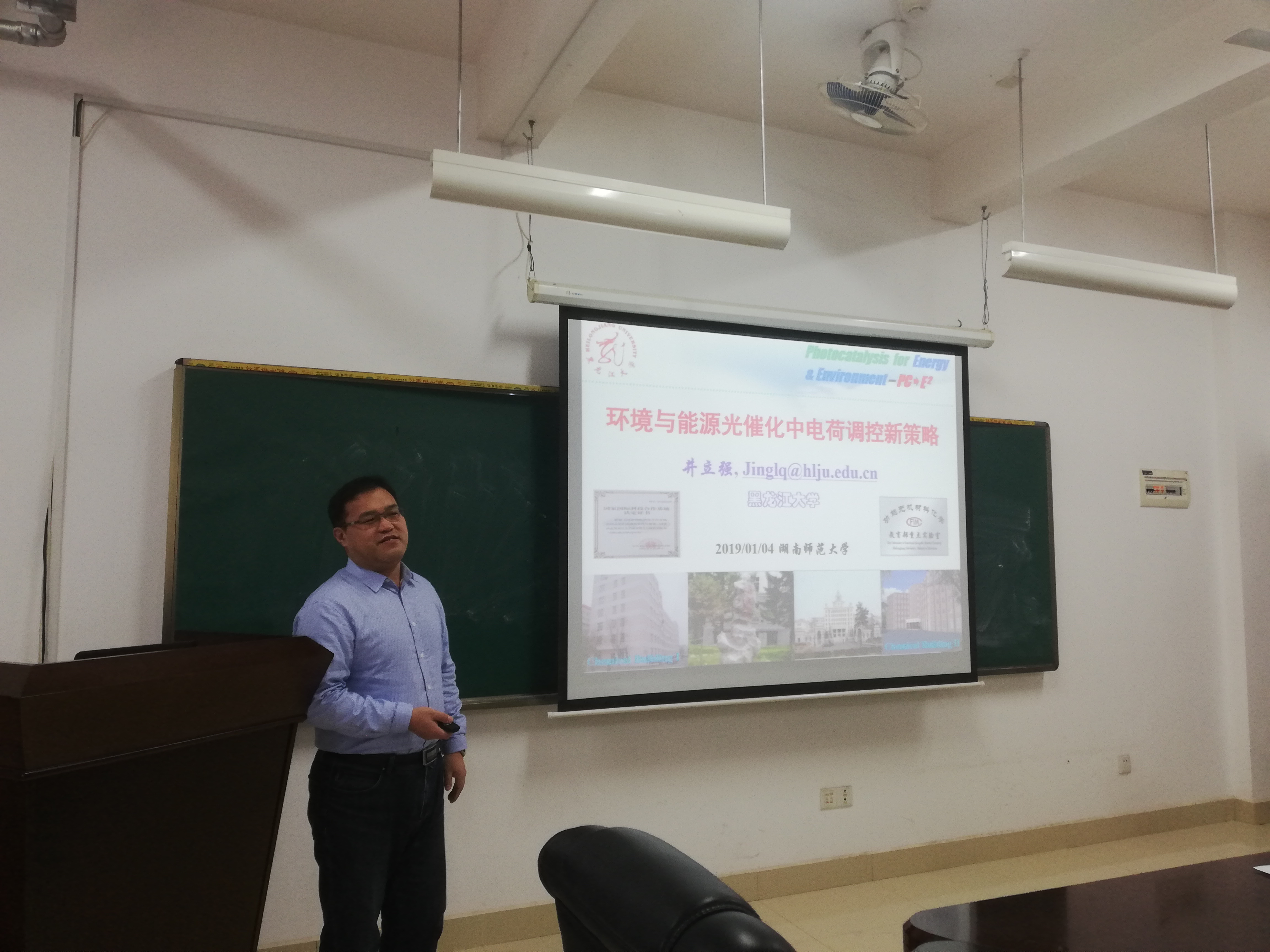 2019年01月04日下午15:00于化工院新楼206会议室,黑龙江大学井立强教授为我院师生带来一场题为“改善光催化转化环境物质性能的光生电荷调控新策略”的学术报告,报告由我院副院长宋建新教授主持,我院部分老师和学生聆听了此次报告。报告围绕“吸附氧对光生电子的调控、适当能级平台对可见光生电子的调控、表面极化对光生空穴的调控”等三个方面进行了深入浅出的剖析。报告尾声,我院学生和老师就相关问题请教了井立强教授,井教授均耐心细致的解答了所有的问题,获得了听众的阵阵掌声。