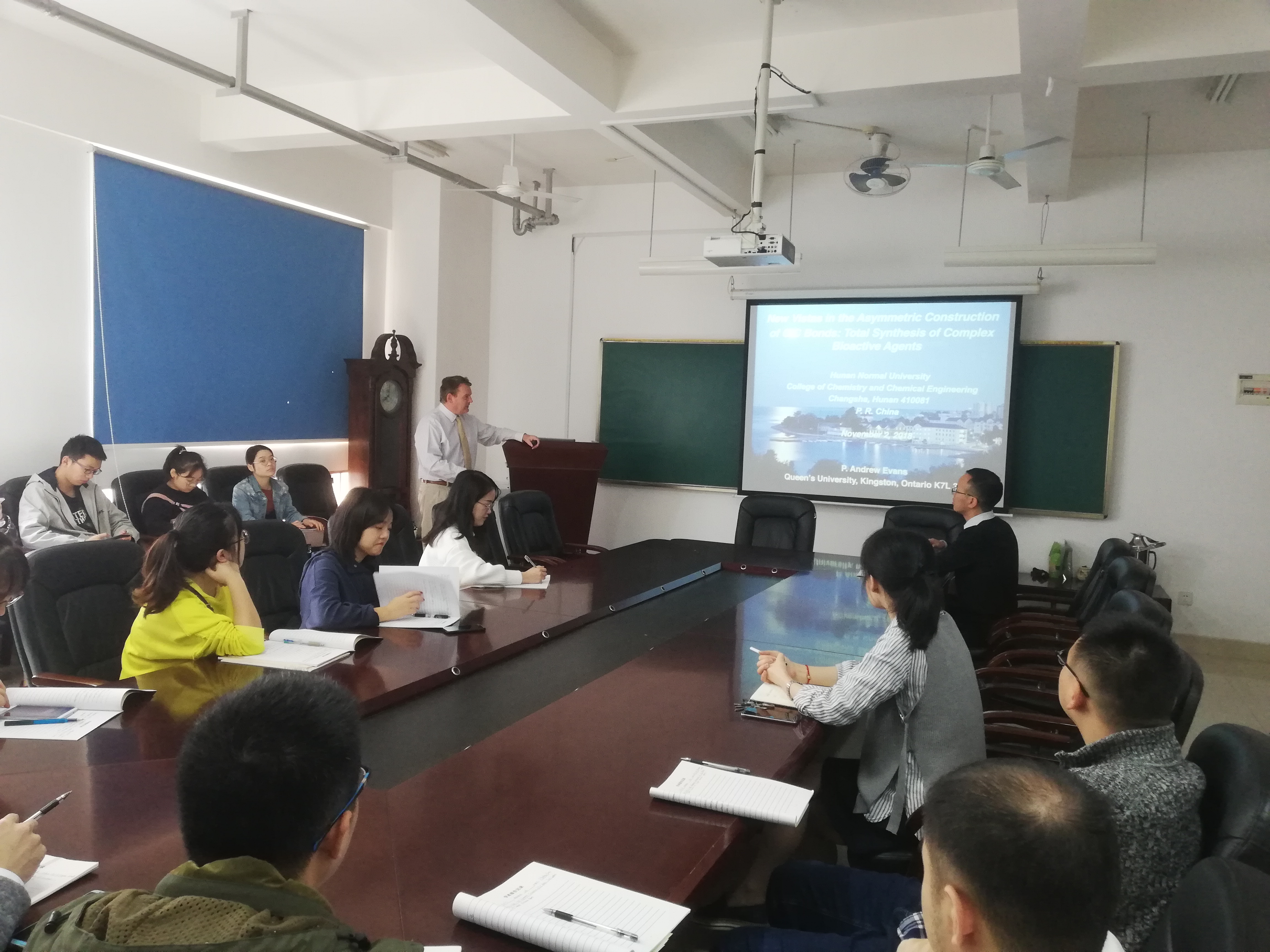 2018年11月5日上午10:00在化工院206会议室,加拿大女王大学P. Andrew Evans教授为我院师生带来一场题为“New Vistas in the Asymmetric Construction of C-C Bonds: Total Synthesis of Complex Bioactive Agents”的学术报告。报告由我院尹鹏老师主持,我院部分老师和研究生聆听了此次报告。