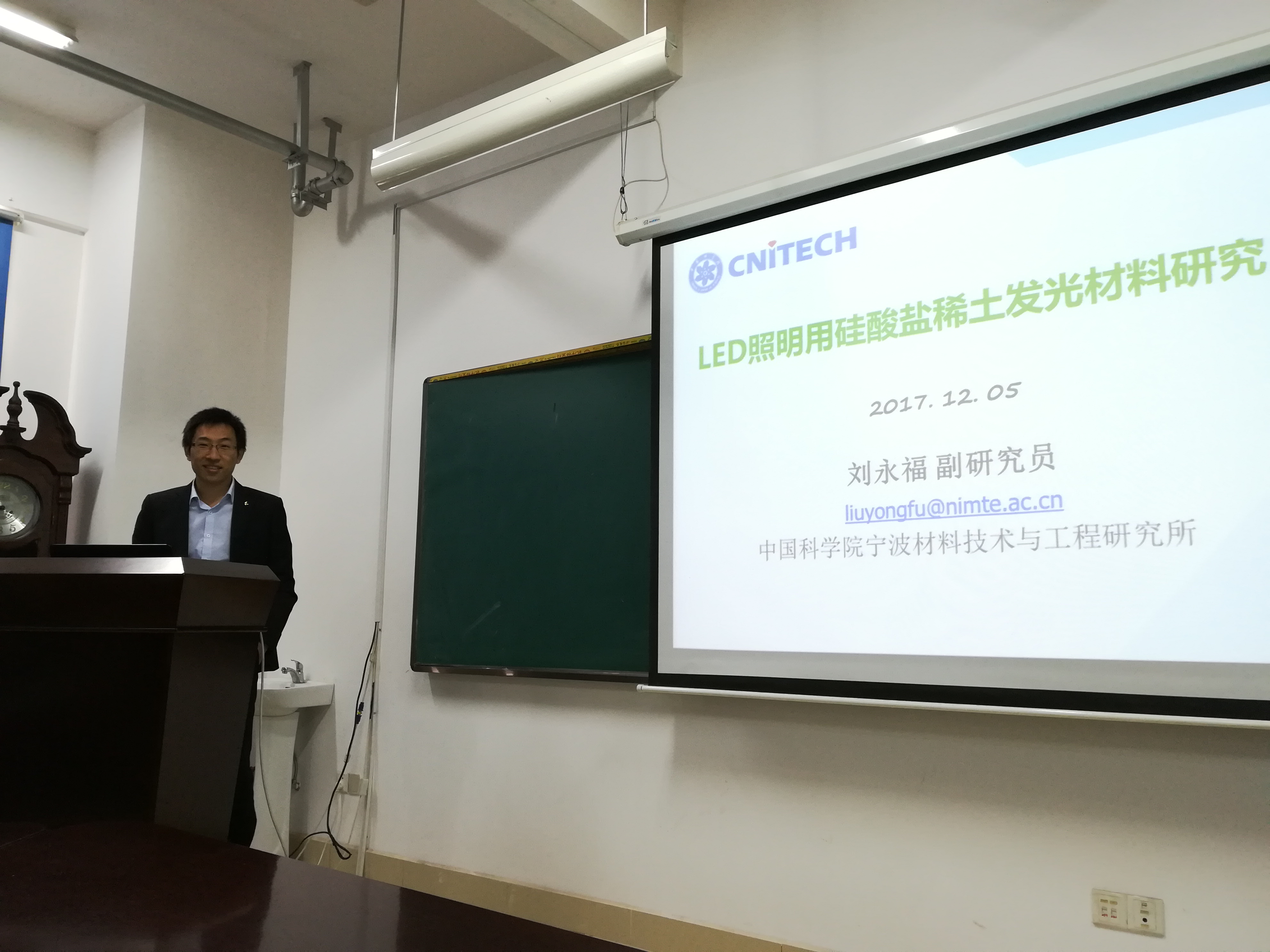 2017年12月4日上午十点,中国科学院宁波材料技术与工程研究所刘永福研究员做客化学化工学院,给化学化工学院师生带来了一场题为“LED照明用硅酸盐稀土发光材料研究”的学术报告。报告由院长陈波教授主持,化学化工学院部分师生聆听了此次报告。