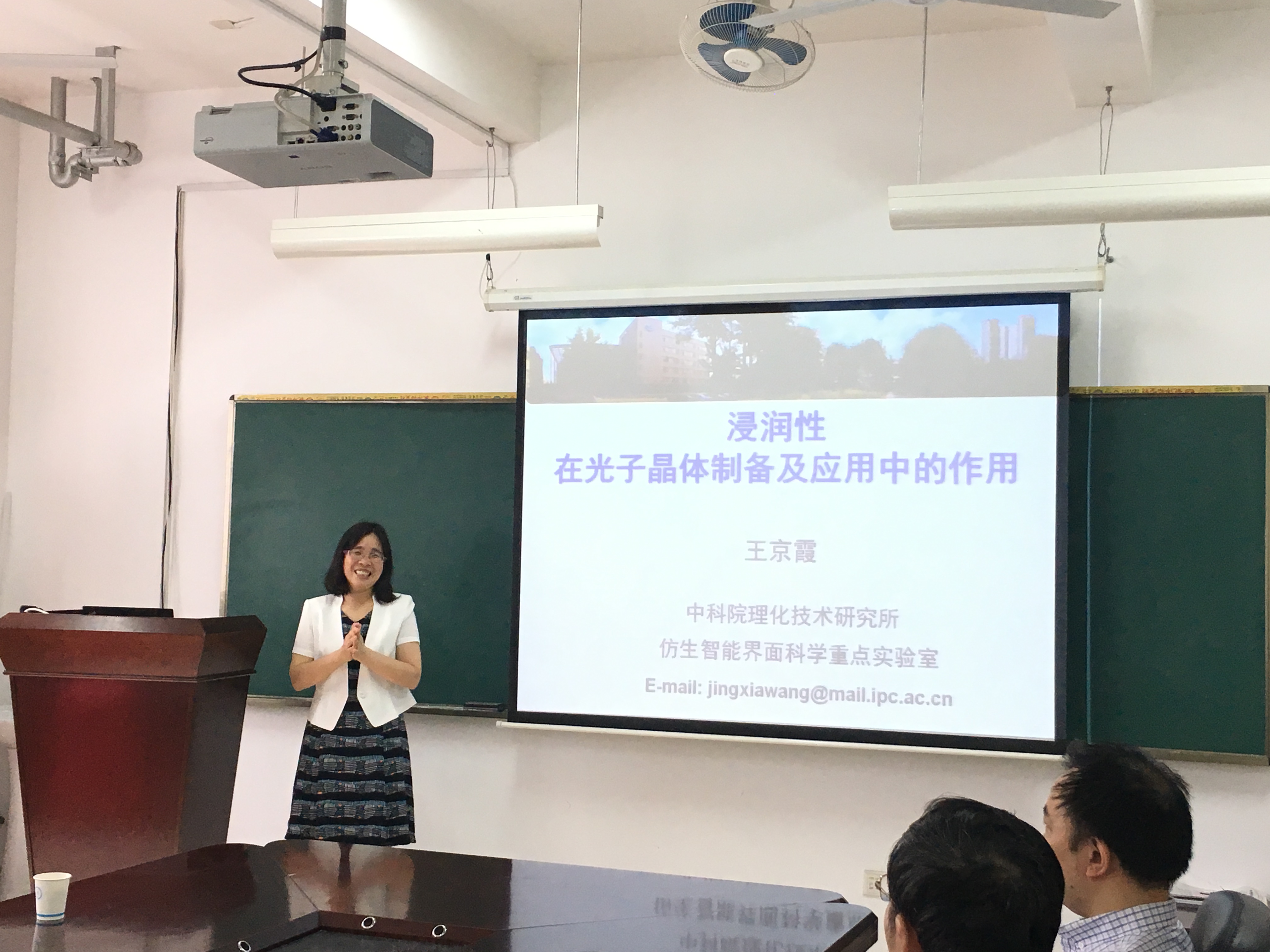 2017年5月22日上午9点,中科院理化所王京霞研究员做客化学化工学院,为我院师生带来一场题为“浸润性在光子晶体制备及应用中的作用”的学术报告。报告由我院廉世勋教授主持,副院长宋建新教授及化学化工学院部分老师、研究生聆听了此次报告。