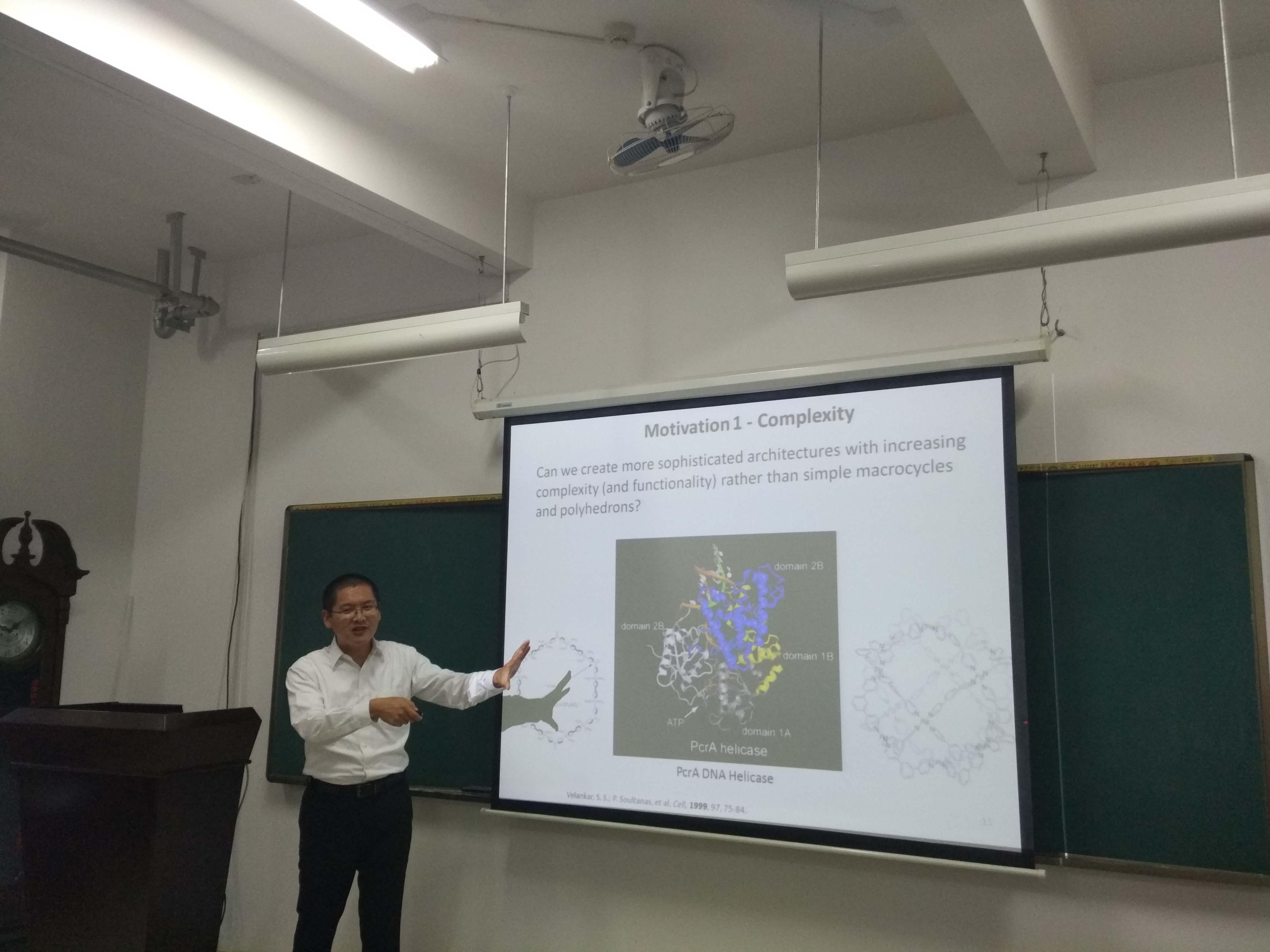 史晓东教授主要从事有机合成方法学及金属有机化学的研究,已经成功开发出新型的多种三氮唑—金属络合催化剂。史晓东教授研究方向的研究方向主要致力于三氮唑作为金属配体的方法学以及三氮唑在材料和生物化学的探索。本次报告正是对这部分内容进行了详细的介绍,史晓东教授首先介绍研究背景,然后围绕三氮唑作为金属配体的研究进展,以及改进措施等内容进行了详细精彩的介绍。报告结束后,师生们的反应热烈,同时积极地提出了自己的一些疑问和建议,史晓东教授耐心仔细的逐一解答,获得了在座听众的热烈掌声。