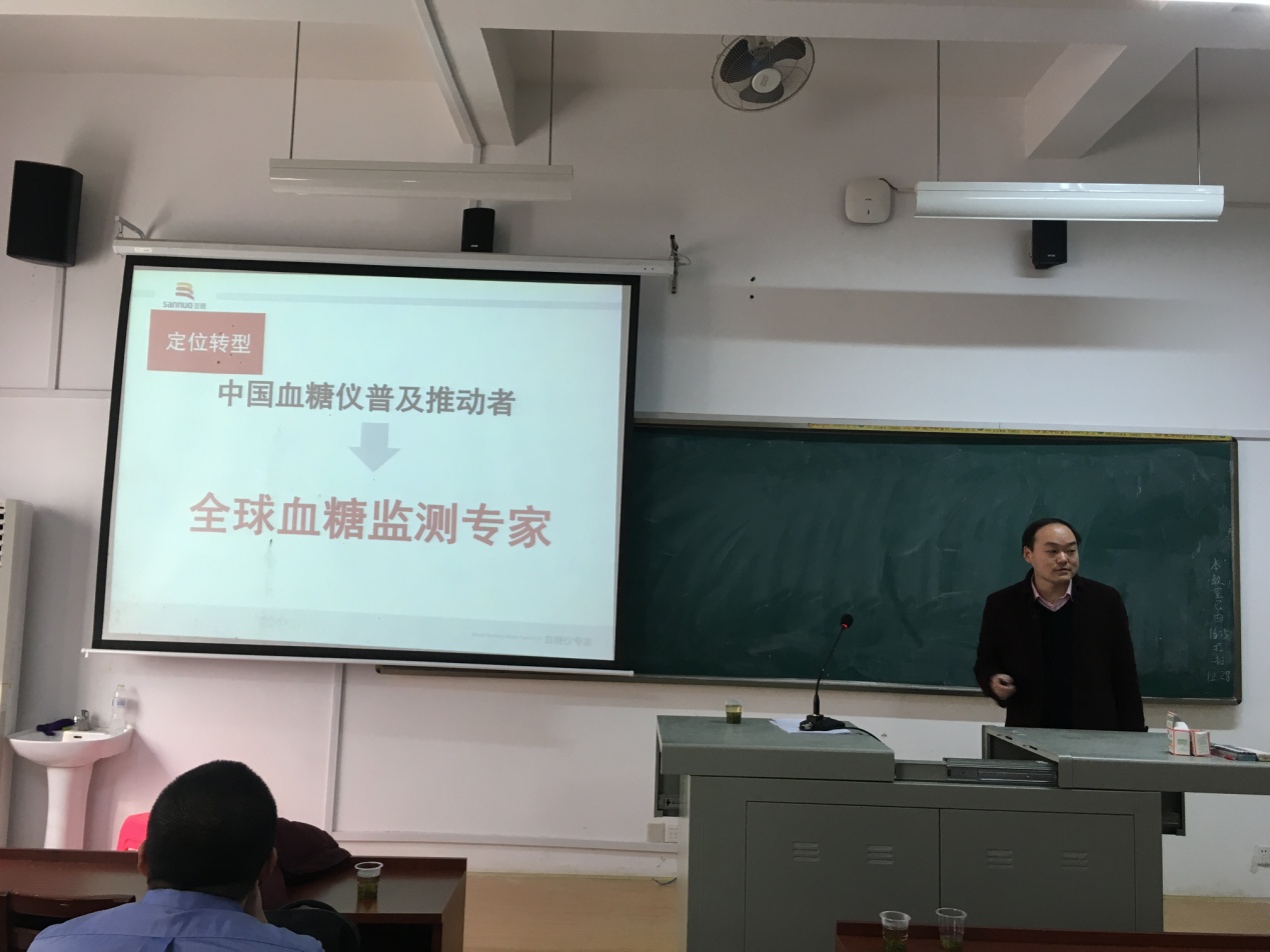 其后,三诺生物代表、太阳集团电子游戏2013 届博士毕业生—黄钊博士进行学术报告。报告主要介绍了三诺生物持续创新的发展史、检测系统的应用价值、近期的主要工作:便携式血肌肝及时检测系统(POCT)及动态血糖监测系统(CGMS)的开发以及相关产品开发的流程。最后,黄钊博士作为校友就谋划个人职业发展进行了阐述和交流。报告结束后两位专家还与现场师生进行了互动,对于老师和学生们提出的问题进行详细的解答,赢得了在座听众的阵阵掌声。到此,学术报告圆满结束,老师和学生们都受益匪浅。
