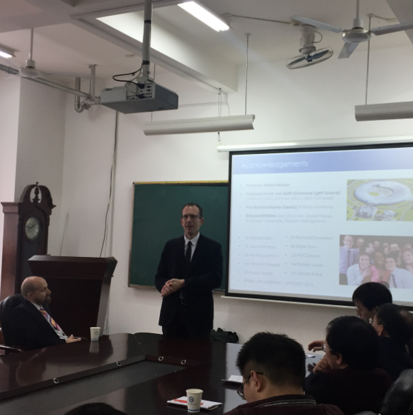 Marsden教授首先介绍了药物研发的最新进展,然后列出了潜在药物分子筛选的三个条件:分子量、水溶性、分子形状。根据这三个条件,Marsden教授对大量合成出来的分子进行计算机筛选,并进行蛋白-小分子作用的实验。通过对蛋白-小分子复合物进行同步辐射X-射线单晶衍射实验,获得复合物的晶体结构,从而解释了药物小分子的作用机理。最后,Marsden教授对Leeds大学进行了简要的介绍。Marsden教授的研究极具系统性,在场的老师与同学仔细聆听了Marsden教授的报告,并在报告后与其进行了交流。