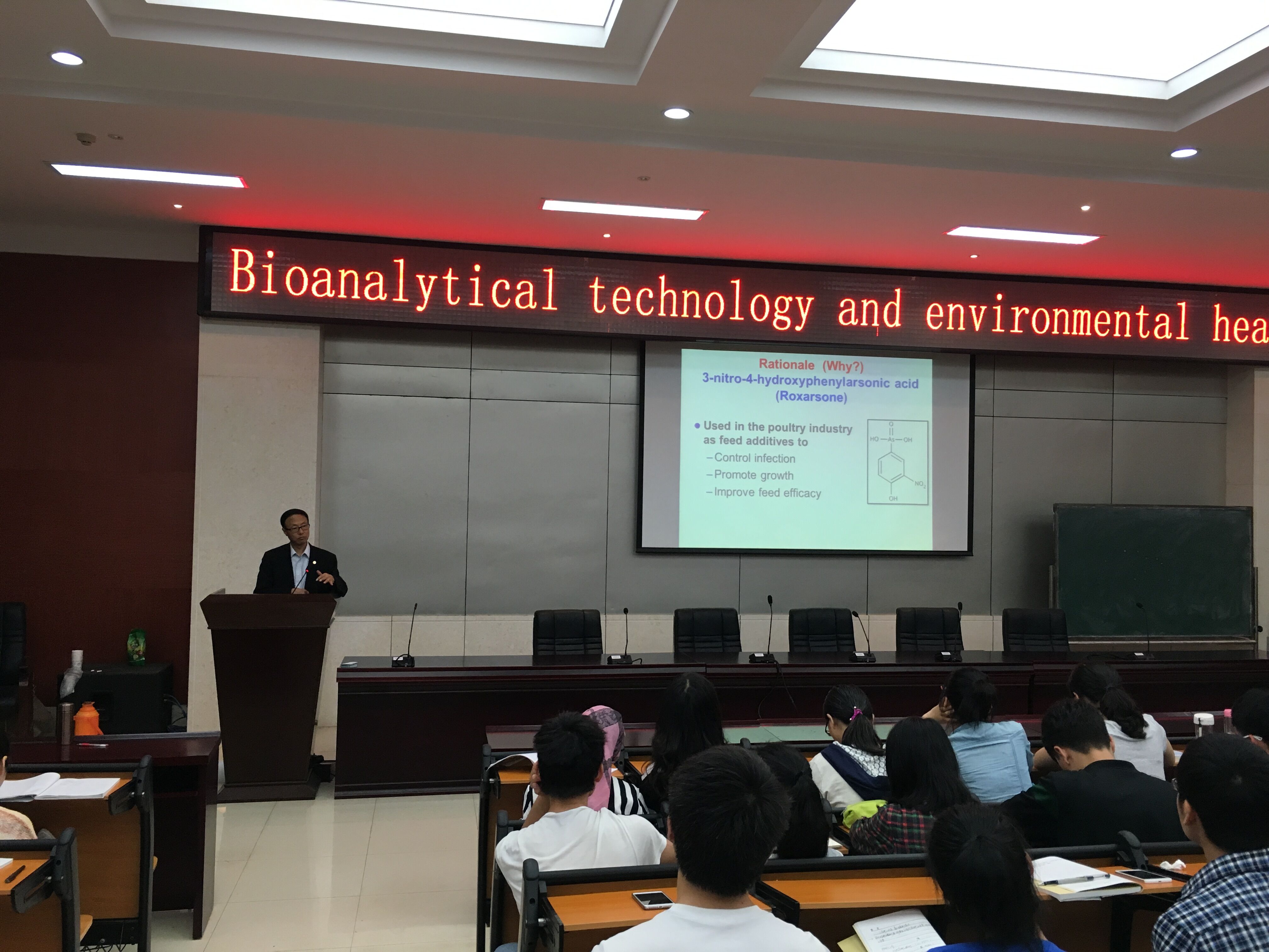 乐晓春教授作了以“Bioanalytical technology and environmental health”为题的精彩学术报告。该报告首先简单介绍了砷对人类影响面之广,随后介绍了砷的来源以及不同形态的砷毒性不同,重点介绍了其科研团队所开展的砷的研究,包括不同形态砷的检测、代谢过程、DNA修复和其与蛋白质的作用,最后以实例向大家展示了如何开展科研工作。