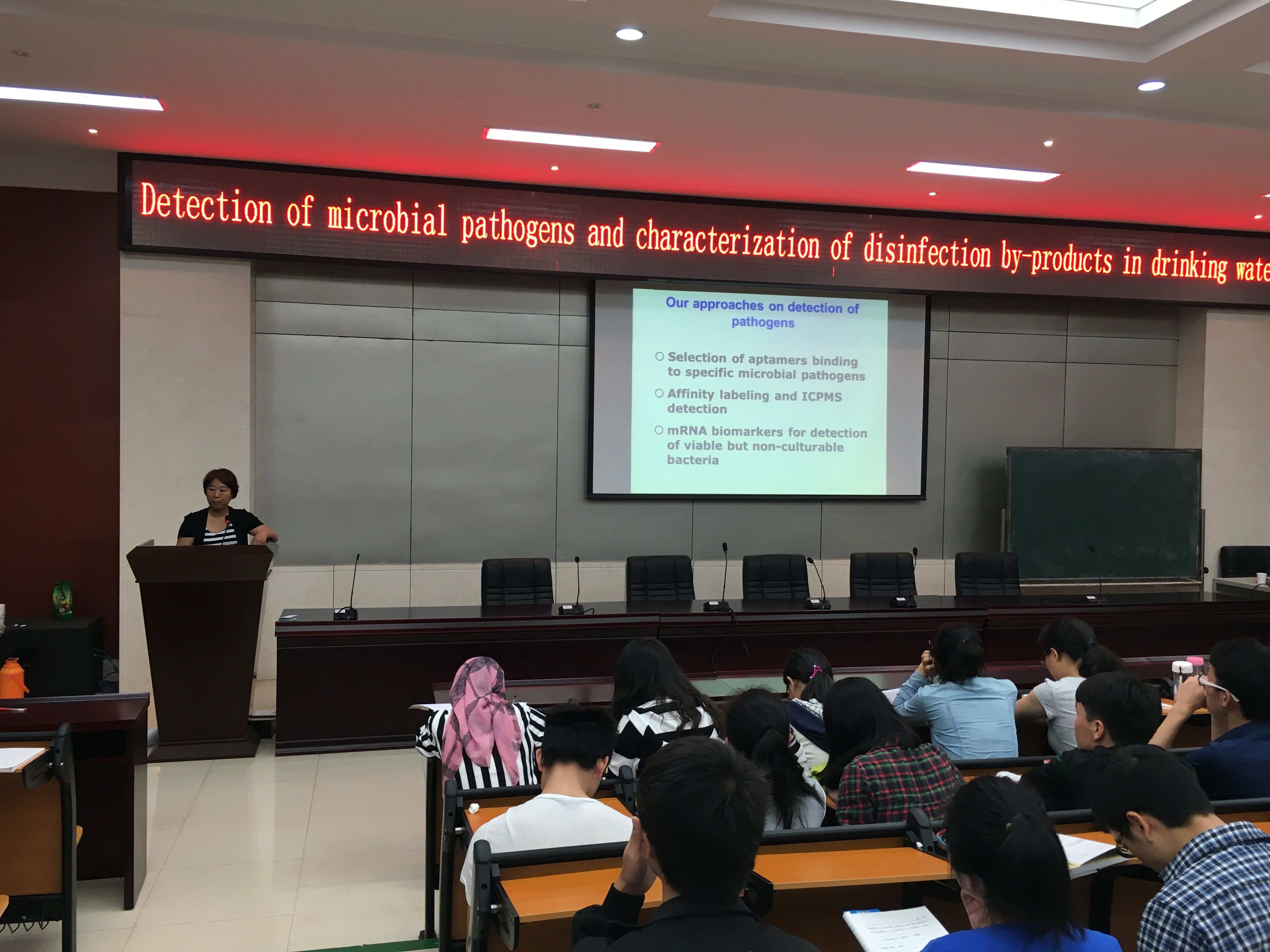 李杏放教授做了以“Detection of microbial pathogens and characterization of disinfection by-products in drinking water” 为题的精彩学术报告。报告首先介绍了饮用水消毒的必要性,但是其研究发现饮用水消毒后会产生附带产物,而且部分可能对人体有害,最后介绍了科研团队对消毒水的DBPs的毒理研究及相关工作,并鼓励学生和老师参与到饮用消毒水的研究中来。