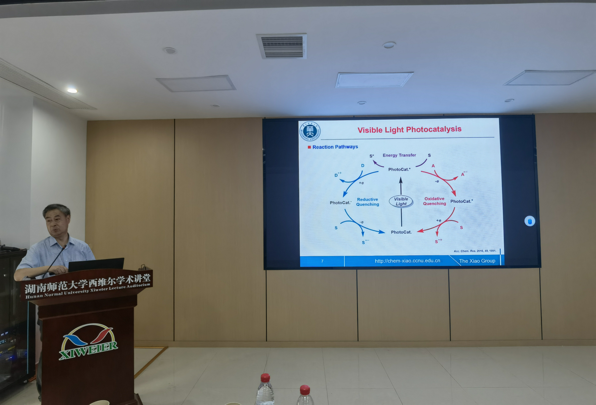 肖文精教授的报告题目为《可见光诱导的可控自由基反应及相关合成转换》,介绍了课题组在可见光诱导可控自由基反应研究领域的重要进展。报告内容丰富精彩,给在座师生留下来深刻的印象。报告会结束后,肖文精教授对师生提出的相关问题给予了详细的解答。