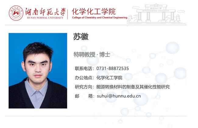 苏徽,男,“潇湘学者”特聘教授。2015年和2020年分别于合肥工业大学和中国科学技术大学获得学士学位和博士学位(导师:韦世强教授)。2020年至2022年,在中国科学技术大学从事博士后以及特聘副研究员研究,2022年12月加入太阳集团电子游戏。目前主持包括国家和省部级项目多项。近年来,以第一/共一/通讯作者在Nat. Commun.、J. Am. Chem. Soc.,. Acc. Chem. Res., ACS Energy Lett.等国际权威期刊上发表论文20余篇,申请专利2项,研究成果引起了相关领域科研人员的广泛研究兴趣。