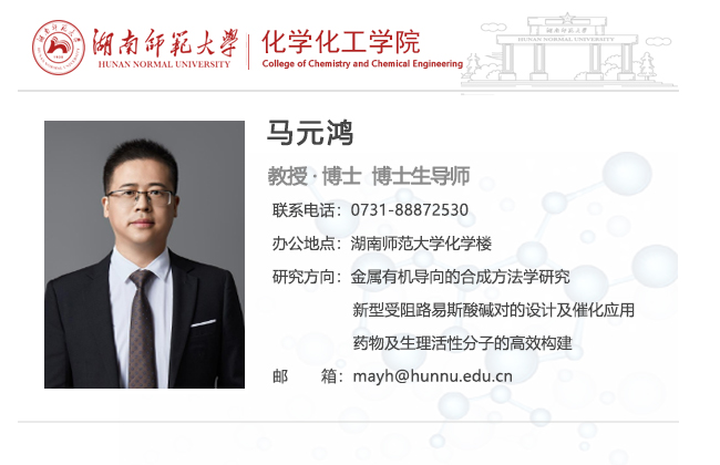 马元鸿,男,教授,“潇湘学者”特聘教授,湖南省高层次计划人才。2008年和2011年分别于西北师范大学获得理学学士和理学硕士学位(导师:李政教授),2014年于四川大学有机化学专业获得理学博士学位(导师:游劲松教授)。2014年9月至2018年1月,在日本国立理化学研究所从事博士后研究(合作导师:侯召民教授)。2018年2月至2019年12月,在德国马克斯-普朗克煤炭研究所开展博士后研究(合作导师:J. Cornella博士)。2020年1月高层次人才引进加入太阳集团电子游戏从事有机化学相关的教学与科研工作。近年来一直致力于金属有机化学、有机合成化学、有机功能材料等方面的前沿研究,主持和参与了包括国家863计划、国家自然科学基金项目在内的诸多科研项目,在所从事的领域取得了一系列开拓性研究进展,截至目前,已经在Chem. Soc. Rev.、J. Am. Chem. Soc.、Angew. Chem. Int. Ed.、ACS Catal.、Org.Lett.、Chem. Commun.、Chem. Eur. J等国际知名化学期刊发表论文20余篇。