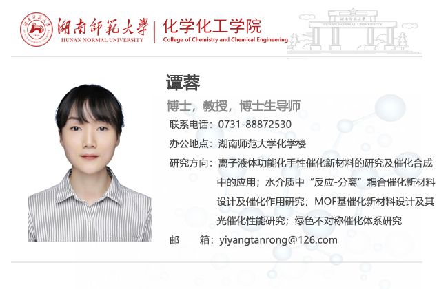 谭蓉,理学博士,教授,博士生导师。湖南省杰青。湖南省121人才工程第二层次人选,入选“湖湘青年英才培养计划”。2009年留校工作,围绕精细化学品的绿色催化合成开展研究,获得了一批原创性的研究成果,引起国内外同行的高度关注。以通讯/第一作者,在J. Catal.(6篇),Green Chem.(3篇)等刊物发表高水平研究论文50余篇,论文被SCI引用1000余次。获授权国家发明专利6项。作为第1完成人,获湖南省自然科学奖二等奖、离子液体与绿色过程青年创新奖和湖南省青年化学化工奖等多项荣誉。先后主持国家自然科学基金(4项)和湖南省杰出青年基金等多项课题。担任中国化工学会离子液体专业委员会委员和精细化工专业委员会青年委员。