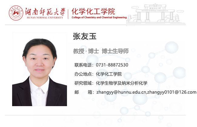 张友玉,博士,二级教授,博士生导师。主要从事化学生物学及纳米分析化学等领域的研究。主持国家自然科学基金面上项目5项,国家基金重点项目协作项目1项,省部级重点及一般项目10余项。以第一作者和通讯作者在Sci. Adv.,Angew. Chem. Int. Ed., Anal. Chem., Chem. Commun.等国际著名刊物上发表高水平研究论文200余篇,获国家授权发明专利7项。获湖南省自然科学奖二等奖1项,湖南省科学技术进步奖二等奖1项,中国分析测试学会科学技术奖(CAIA奖)二等奖1项。获2018年太阳集团电子游戏芙蓉百岗明星称号。