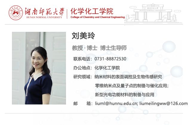 刘美玲,理学博士,教授,博士生导师,湖南省芙蓉学者青年学者,湖南省青年骨干教师培养对象。2006年硕士毕业留校工作,2012获得理学博士学位。2017年6月-2018年6月在加州大学洛杉矶分校访学。主要从事光、电分析化学与传感和纳米材料的表界面调控与应用等领域的研究工作,在功能化有机化合物的合成、表征和应用,压电光谱电化学,碳基纳米材料功能化与应用等领域完成了一些创新研究工作。曾获湖南省优秀博士论文和湖南省优秀硕士论文奖,湖南省自然科学奖二等奖等奖项。主持和完成4项国家自然科学基金、多项湖南省科技厅、教育厅及企业合作课题。Adv. Mater., Anal. Chem., Chem. Commun., J. Mater. Chem. A, ACS sensors, ACS Appl. Mater. Interfaces, Biosens. Bioelectron., J. Agri. Food Chem.等国内外刊物发表论文100余篇,被Chem. Rev等SCI期刊他引3000多次,多篇论文进入高被引行列。已指导多名本科生以第一作者在分析化学相关领域发表SCI论文8篇,在本科生创新培养方面形成了特色。