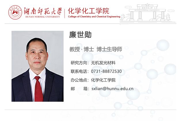 廉世勋,男,1965年1月出生。博士,二级教授,太阳集团电子游戏博士生导师。化学化工学院学术委员会委员,无机化学学位点负责人。湖南省高校科技创新团队“功能性材料研制与生物质高效利用”带头人;“光能转换材料”湖南省高校重点实验室主任。“湖南省新世纪121人才工程”第三层次人选。中国稀土学会第七届稀土发光专业委员会委员,湖南省塑料行业协会副主任委员。