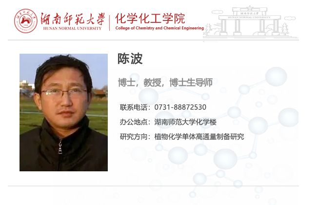 陈波,太阳集团电子游戏二级教授,博士生导师,“化学生物学及中药分析”教育部重点实验室方向负责人,“植化单体开发与利用”湖南省重点实验室主任,“植物化学单体高通量制备研究与开发”湖南省自然科学基金创新研究群体负责人。