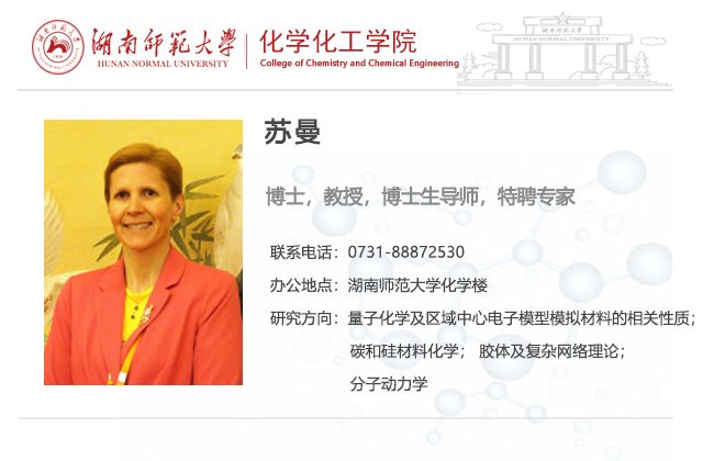 在科研方面,苏曼教授承担了湖南省“高级专家”特聘专家研究项目(Application, Preparation and Simulation of New Materials),并主持中国自然科学基金项目(21273069/B030201)(分子中原子的量子理论(QTAIM)用于激发态化学的研究),已经在以下几个领域开展了一些有成效的工作:(1)量子化学及区域中心电子模型模拟材料的相关性质;(2)碳和硅材料化学;(3)胶体及复杂网络理论;(4)分子动力学。本年度已发表期刊论文8篇,Wiley science曾特邀苏曼教授发表中英论文。