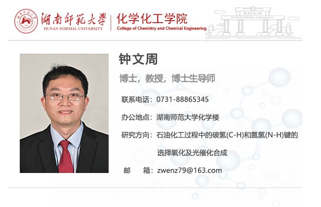 钟文周,教授,博士生导师,化学工程与技术专业博士,湖南省普通高校青年骨干教师培养对象。长期从事石油化工过程中的碳氢(C-H)和氮氢(N-H)键的选择氧化及光催化合成技术的研发工作。目前主持国家自然科学基金面上项目、湖南省自然科学基金一般项目、湖南省重大科技专项子项目和湖南省教育厅一般项目各1项;作为主要成员参与完成国家自然科学基金2项,湖南省自然科学基金2项。近年来相关研究工作以第一作者或通讯作者在Journal of Catalysis, Applied Catalysis B Environmental,Green Chemistry, Chemical Engineering Journal, Applied Catalysis A General, RSC Adv., Catal. Commun.等刊物发表论文20余篇,申请国家发明专利3项,授权专利1项。同时与企业开展多项课题合作,主持委托“铁系除氧剂开发(北京君合百安仓储科技有限公司)”研发,参与委托“五氯苯酯工艺”(湖南京西祥隆化工有限公司)、“4E合成工艺”(上海泰禾有限公司)、“ZHP分子筛组成分析方法的建立”(中国石化催化剂有限公司)研发。