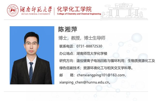 陈湘萍,博士,教授,博士生导师;本科毕业于中国海洋大学,博士毕业于中南大学,新加坡南洋理工大学Research Fellow,石化新材料与资源精细利用国家地方联合工程实验室副主任,省级高层次青年人才;曾就职于中国科学院城市环境研究所(2015-2016,助理研究员)和陕西科技大学(2016-2022,副教授、教授);以第一/通讯作者在Chem. Eng. J., J. Hazard. Mater., Green Chem.等期刊发表学术论文40余篇(ESI 1%高被引/ESI 0.1%热点论文5篇,总被引3000余次,Hi-index=24),在Springer-Nature合著专著1部;授权国家发明专利5项,转让1项;承担国家级项目/课题(3项)、省部级重点/人才项目、横向课题等10余项;现任巴塞尔公约亚太区域中心化学品和废物环境管理智库专家、中国有色金属学会环保分会委员等,及Circular Economy、《中国有色金属学报》(中英文版)、《稀有金属》等期刊编委/青年编委;主讲《化工原理》等专业课程,培养的毕业生大多进入国家电网、城投、宁德时代、比亚迪、西安交通大学、中南大学、利兹大学等国内外知名企业或高等院校就职或深造。