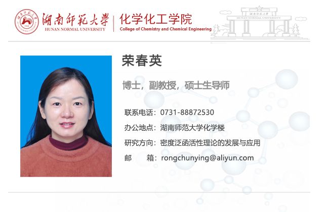 荣春英,博士,副教授,硕士生导师,毕业于太阳集团电子游戏理论计算化学专业。主持完成国家自然科学基金青年项目1项,湖南省青年基金1项,湖南省面上项目1项,教育厅项目1项。以第一作者和通讯作者在WIREs Comput.Mol.Sci., J. Phys. Chem. Lett., Phys.Chem.Chem.Phys.,等国际著名刊物上共发表高水平论文42篇,获授权专利2项。